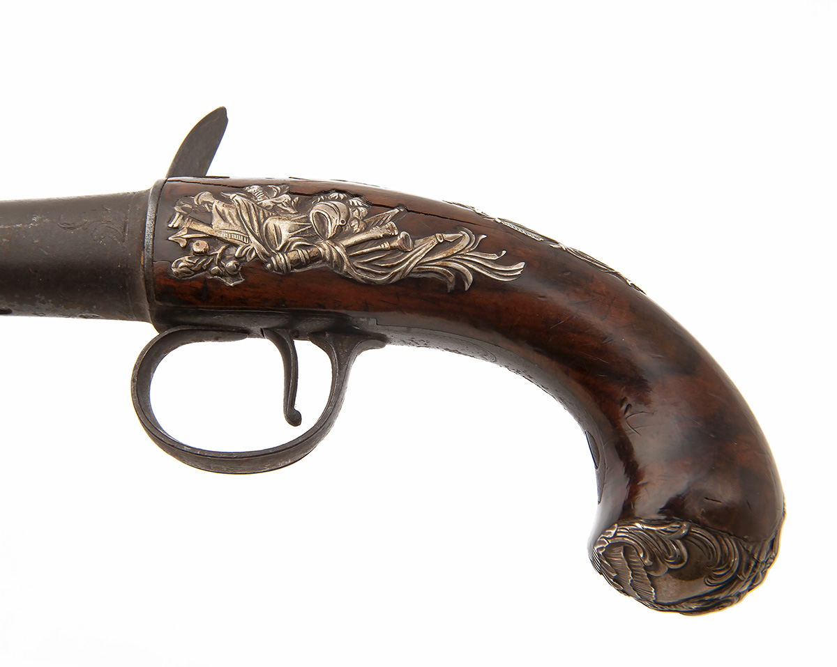circa 1750, with round triple-staged 5 1/4in. turn-off cannon barrel, scroll engraved panel at breech and signed 'GRIFFIN', the underside of breech with London proofs and marked 'BOND STREET LONDON', typical Queen-Anne style action with recumbent 'L' shaped frizzen spring (cock missing in its entirety), white metal carved, moulded and pierced martial trophy sideplate, rococo white metal escutcheon to wrist, unusual white metal pommel-cap featuring an angel with trumpet, the walnut butt-stock with age cracks and guarded trigger, the guard possibly functioning originally as a sliding safe
