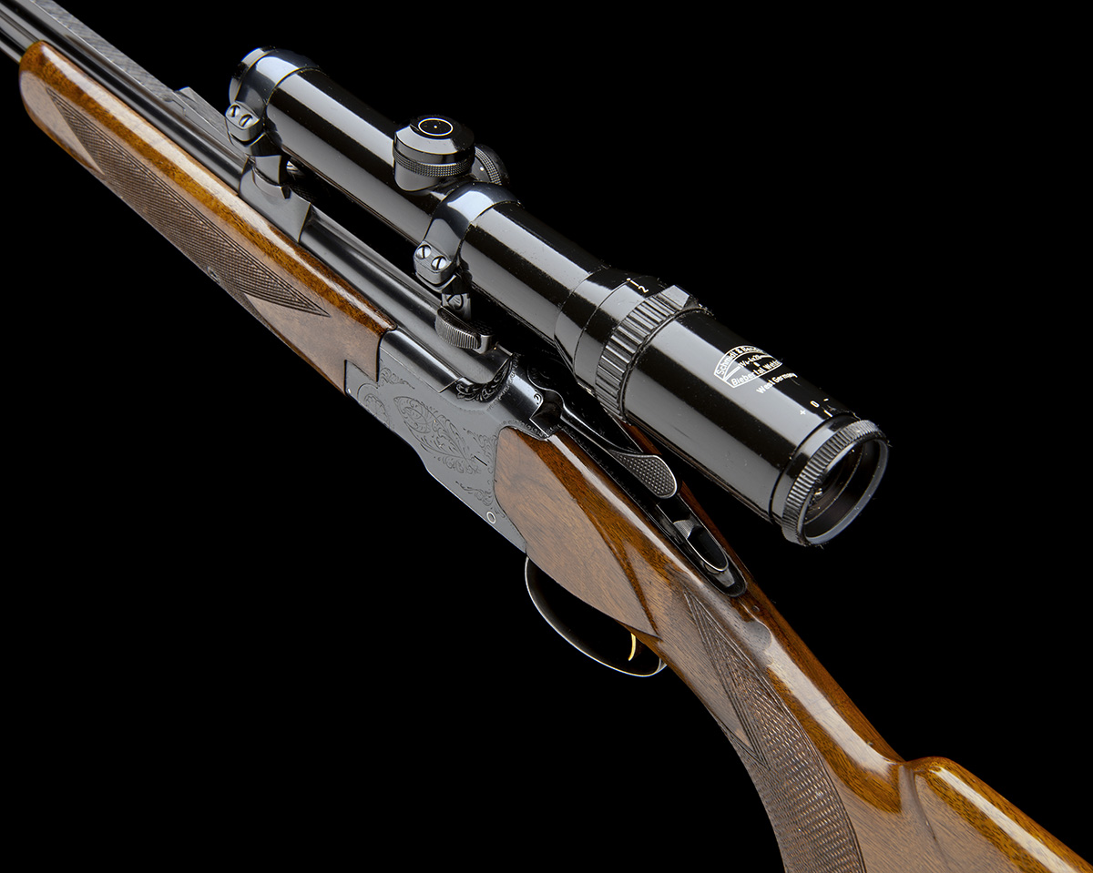 24 1/2in. unsigned Belgian proofed 9.3x74R barrels with stepped solid matt top-rib, ramp rearsight and bead fore-sight, the breech end mounted with a Schmidt & Bender 1 1/4-4x20 telescopic sight, serial no. 132626, in quickly-detachable mounts, hold-open toplever, manual safety with integral barrel selector switch, black action with some scroll engraving, gold-washed trigger, 13 5/8in. pistolgrip stock including 7/8in. rubber recoil pad, weight 6lb. 8oz. (20-bore barrels), 7lb. 13oz. (9.3x74R barrels, unscoped) and 9lb. (9.3x74R barrels, with scope), in a brass-cornered leather case with provision for both sets of barrels and telescopic sight