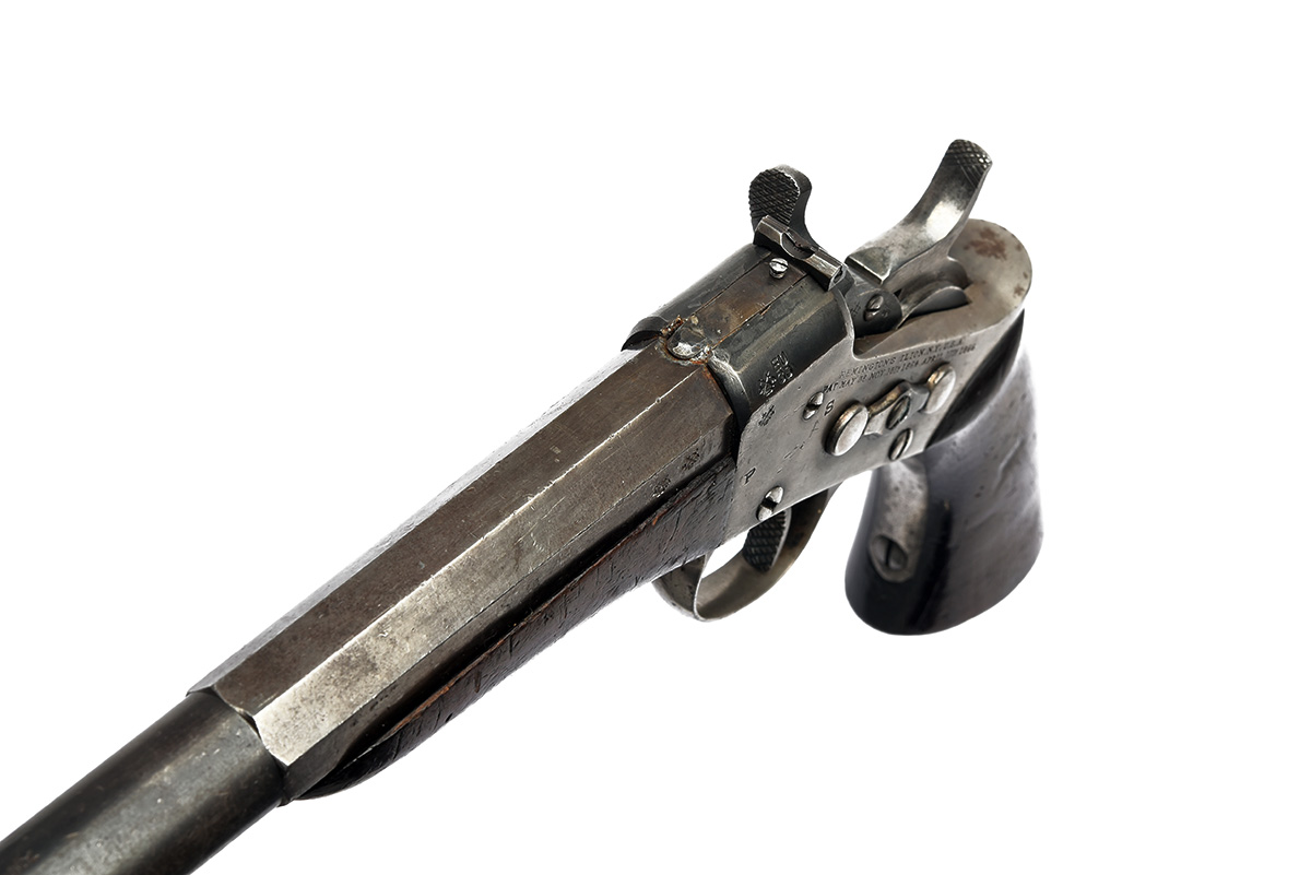 A SCARCE DEACTIVATED REMINGTON, USA .22 L.R. 'MODEL 1901 TARGET' SINGLE-SHOT ROLLING-BLOCK TARGET PISTOL, serial no. 22s, circa 1901-09, with blued two-stage 10in. barrel, dovetailed crescent fore-sight with beaded top, adjustable notch rear-sight, the top of barrel marked 'REMINGTON ARMS. U.M.C CO. ILION, N.Y.', receiver marked 'REMINGTON'S ILION. N.Y. U.S.A. PAT MAY 32. NOV.15TH 1864. APRIL 17TH 1866.', chequered grip, flared walnut grip and walnut splinter fore-end, traces of original finish remaining, together with its 2025 EU deactivation certificate