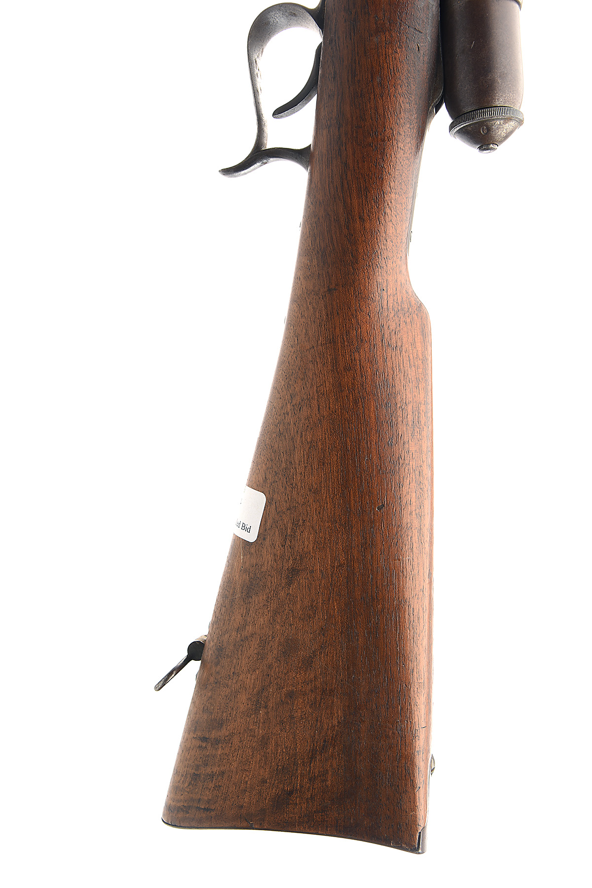 with 33in. barrel fitted with block and blade front-sight and quadrant rear-sight, the action stamped "SOC. IND, SUISSE / SYSTEM VETTERLIN", two piece iron mounted full walnut stock the forend with square cut chequering and three barrel bands, rod missing. The barrel and action with some original blue finish balance to a plum brown patina, action at fault.