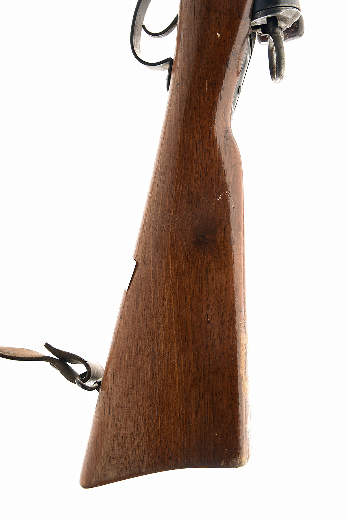 with 19in. barrel (loose, adapted for take-down), straight pull bolt with adapted magazine, walnut butt-stock and separate fore-end, fitted with a period leather sling
