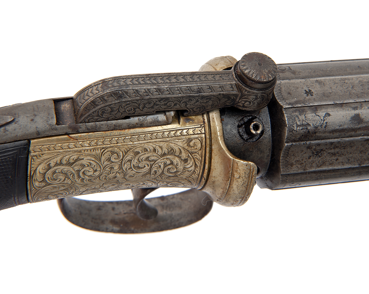 circa 1845, with fully fluted 3in. barrel group, scroll engraving to the muzzles, border engraving at breech, the barrels numbered '1' through '6' respectively, Birmingham proofs, fully scroll and border engraved rounded boxlock central bar-hammer action with integral moulded nipple-guard, sliding safe behind hammer, finely chequered ebony grips backstrap with bag-shaped frame and iron trigger-guard bow