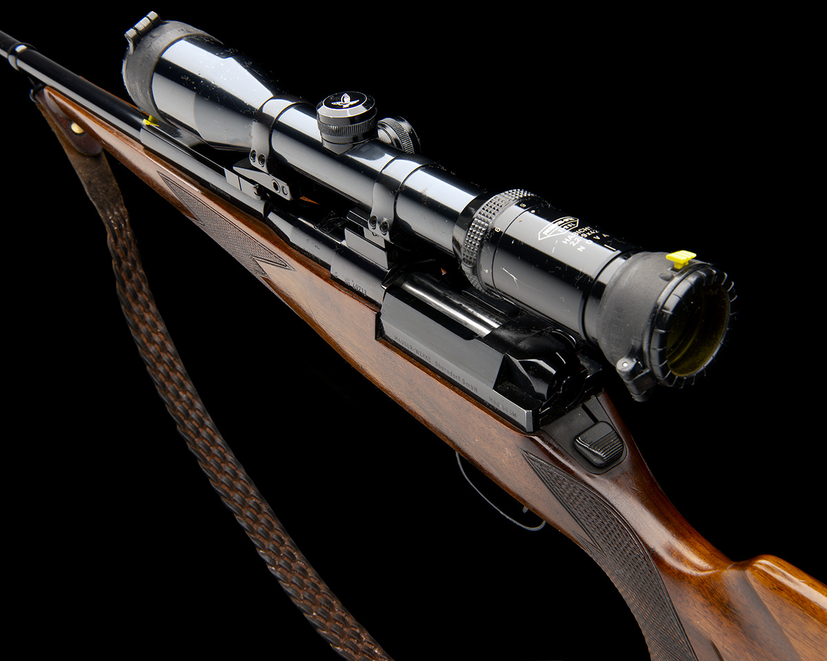 24 1/2in. nitro barrels both with ramp-mounted blade fore-sights, quickly detachable scope mounts, sling swivels, receiver mounted with a Swarovski Habicht 2,2-9x42 Nova telescopic sight, serial no. 224918, set trigger, blued finish overall, pistolgrip stock with sculpted cheekpiece, monte carlo bomb, sling, 13 3/4in. pull including 7/8in. ventilated rubber recoil pad, weight 9lb. 10oz. (scoped), 7lb. 15oz. (unscoped), in a fleece-lined leather slip with provision for extra barrel