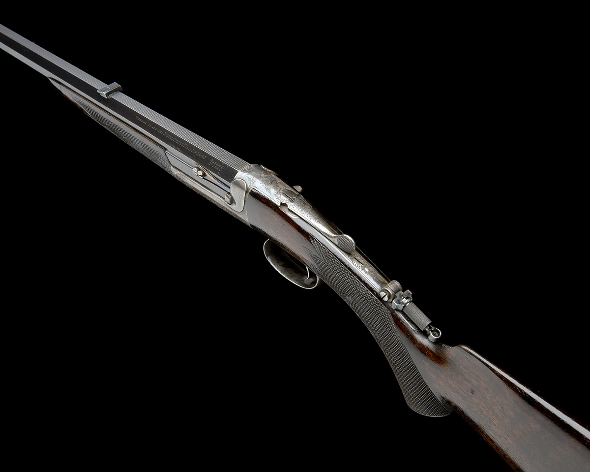 25 7/8in. octagonal barrel with matted top flat, folding aperture fore-sight, two folding leaf rear sights marked for 50 and 100 yards and with white-metal sight lines, the breech-end engraved 'HOLLAND & HOLLAND. 98 NEW BOND ST. LONDON. 295. SEMI SMOOTH BORE. WINNERS OF ALL THE 'FIELD' RIFLE TRIALS. 1883. PATENT NO. 1294.', the top-tang fitted with an adjustable flip-up peep sight, H.W. Holland patent lever-cocking action, patent no. 1294 of 17th March 1882, carved teardrop fences, removable striker disc, manual safety with gold-inlaid 'SAFE' detail, non-selectable ejector, border and acanthus scroll engraving retaining traces of colour-hardening and finish, 14 3/8in. pistolgrip stock with steel buttplate and engraved pistolgrip-cap, Hackett type snap-on splinter fore-end with horn finial, weight 5lb. 9oz.