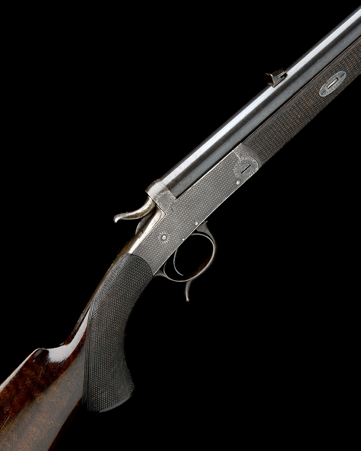 circa 1900, with round tapering 24in. barrel, blade fore-sight, rear-sight of one standing notch with two additional folding leaves, machine engraved slab-sided action with exposed central hammer, under-lever opening, the lever formed around the front of the trigger guard bow, walnut chequered pistol-grip stock with machine engraved iron heel-plate and moulded hard-rubber grip-cap and chequered walnut splinter fore-end secured via a cross-wedge