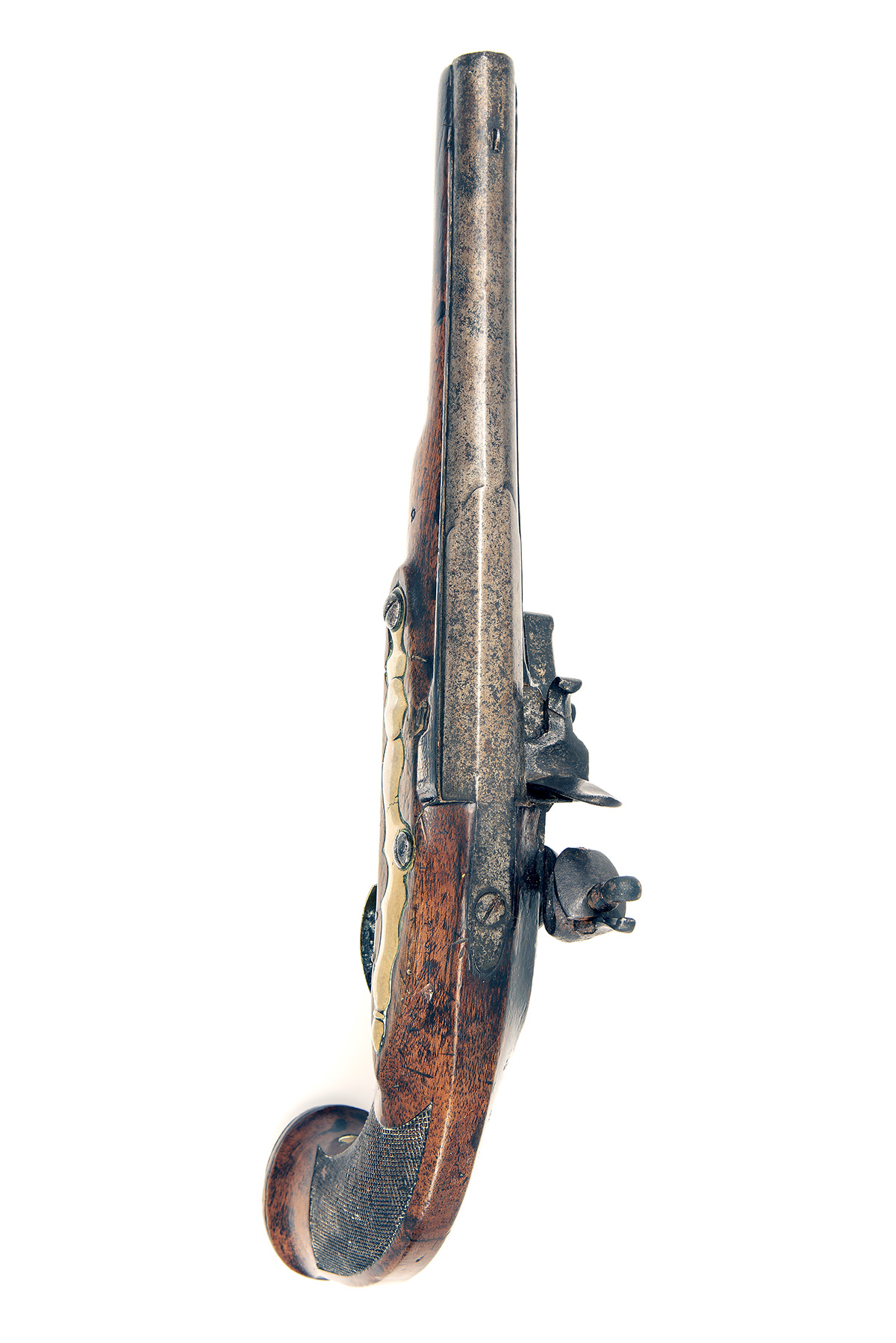 French or Belgian circa 1790, with octagonal to round 8in. barrel, small blade fore-sight to the front of the flat sighting plane, solid top-tang, plain flat lock with pointed tail, lozenge pan, swan-necked cock, bridleless frizzen, walnut full-stock with chequered panels to the grip, moulded band at pommel and bevel-edged flat brass pommel-cap, moulded brass sideplate, pillar fronted brass trigger-guard bow and brass ramrod throat and pipes, replacement ramrod, 14 1/2in. overall, weight approximately 2lbs.