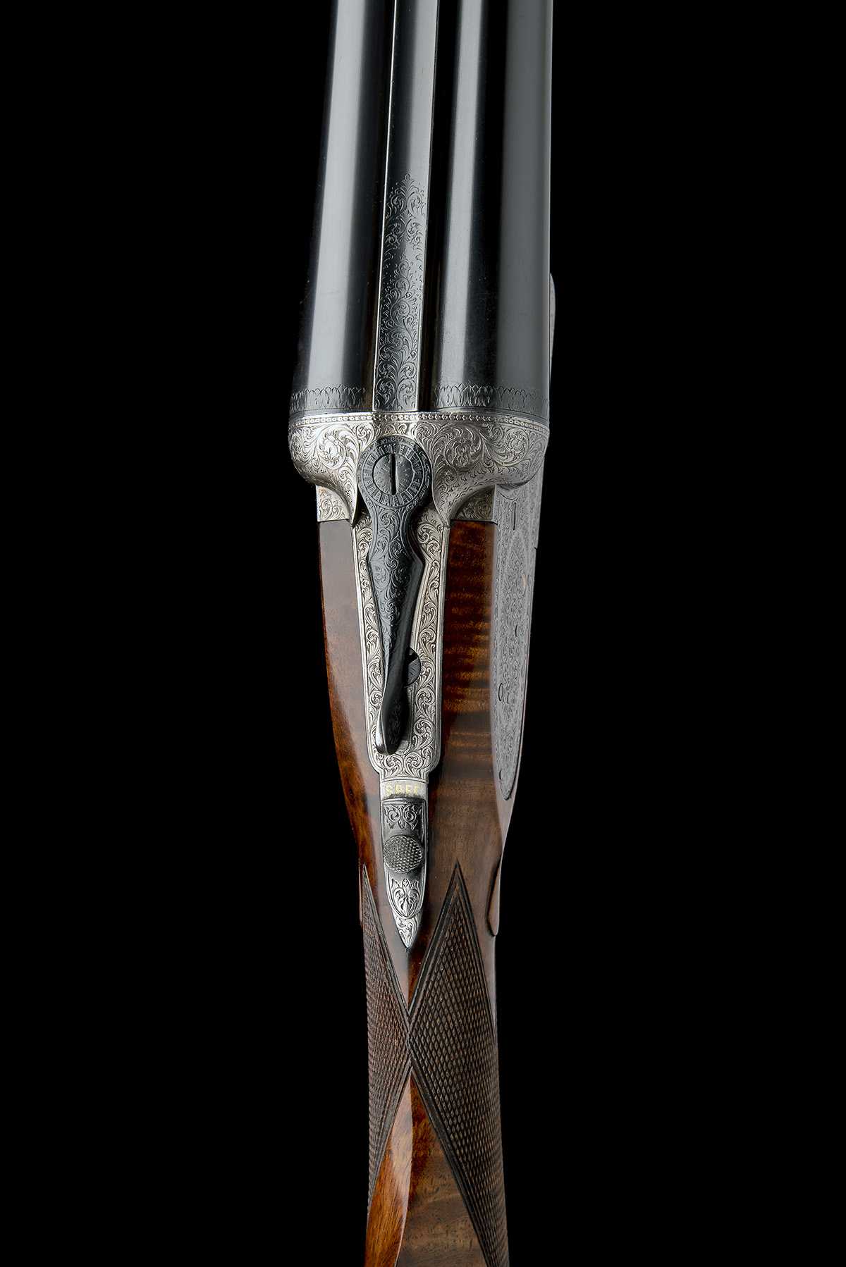 circa 1903, 30in. nitro reproved chopperlump barrels, the rib re-engraved 'P. KNIGHT. CARRINGTON ST. NOTTINGHAM', and with acanthus scroll detailing at the breech end, 2 1/2in. chambers, bored approx. true cyl. and 1/2 choke, some pitting, automatic safety with gold-inlaid 'SAFE' detail, gold-inlaid cocking-indicators, bold acanthus scroll engraving, brushed bright finish, 14 1/4in. replacement stock, weight 6lb. 12oz.