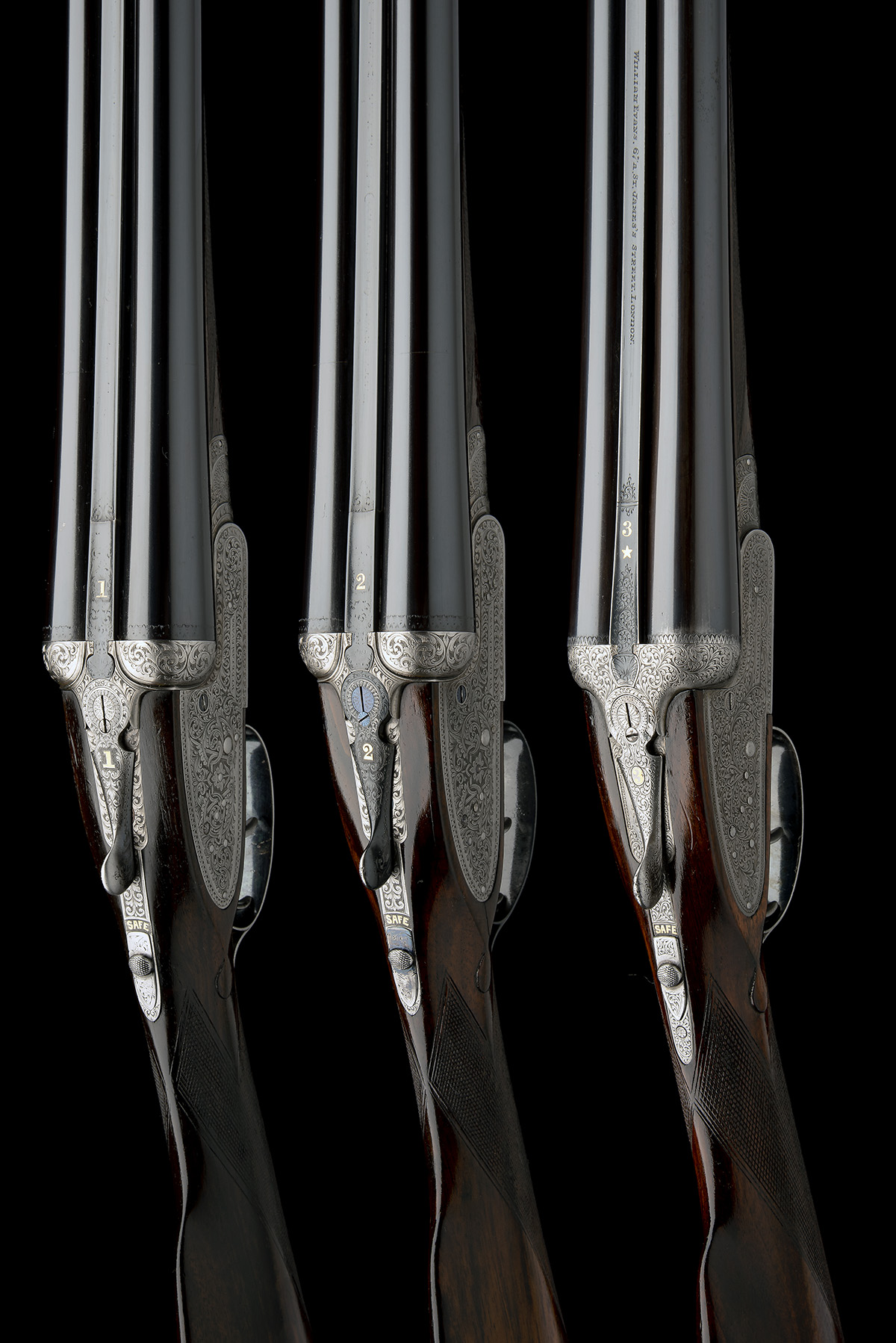 circa 1910 (9935 / 6) and circa 1934 (17193), gun nos. 9935 / 6 with 28in. sleeved nitro barrels, retaining original ribs gold-inlaid '1' and '2' at the breech ends, rib inscriptions worn, 2 1/2in. chambers, bored approx. imp. cyl. and 1/4 choke (No.1 gun with removable Teague choke inserts); gun No.3 with extra 28in. nitro choke barrels (Birmingham proof for 1962), the rib engraved 'WILLIAM EVANS. 67A. ST. JAMES'S STREET. LONDON.', and gold-inlaid '3*' at the breech end, 2 3/4in. chambers, bored approx. full choke in both, treble-grip actions with removable striker discs, toplevers gold-inlaid '1' and '2', automatic safeties with gold-inlaid 'SAFE' details, bold engraving of art nouveau stylised scrolling acanthus and floral designs, retaining very slight traces of original colour-hardening, 15in. well-figured stocks (slight sweep at combs) including 1 1/4in. wooden extensions, weight 6lb. 12oz. (No.1) and 6lb. 10oz. (No.2), gun no. 17193 with 28in. replacement nitro barrels (in 1962), the rib engraved 'WILLIAM EVANS. 67A. ST. JAMES'S STREET. LONDON.', and gold-inlaid '3*' at the breech end, 2 3/4in. chambers, bored approx. full choke in both, treble-grip action with removable striker discs, the toplever gold-inlaid '3', automatic safety with gold-inlaid 'SAFE' detail, bold scrolling acanthus engraving with beaded bordering, 15in. figured stock swept at comb and including 1 1/4in. wooden extension, weight 6lb. 12oz., all in a brass-mounted oak and leather triple guncase with gold-tooled William Evans trade label, lift-out barrel tray (missing right hand side edge)