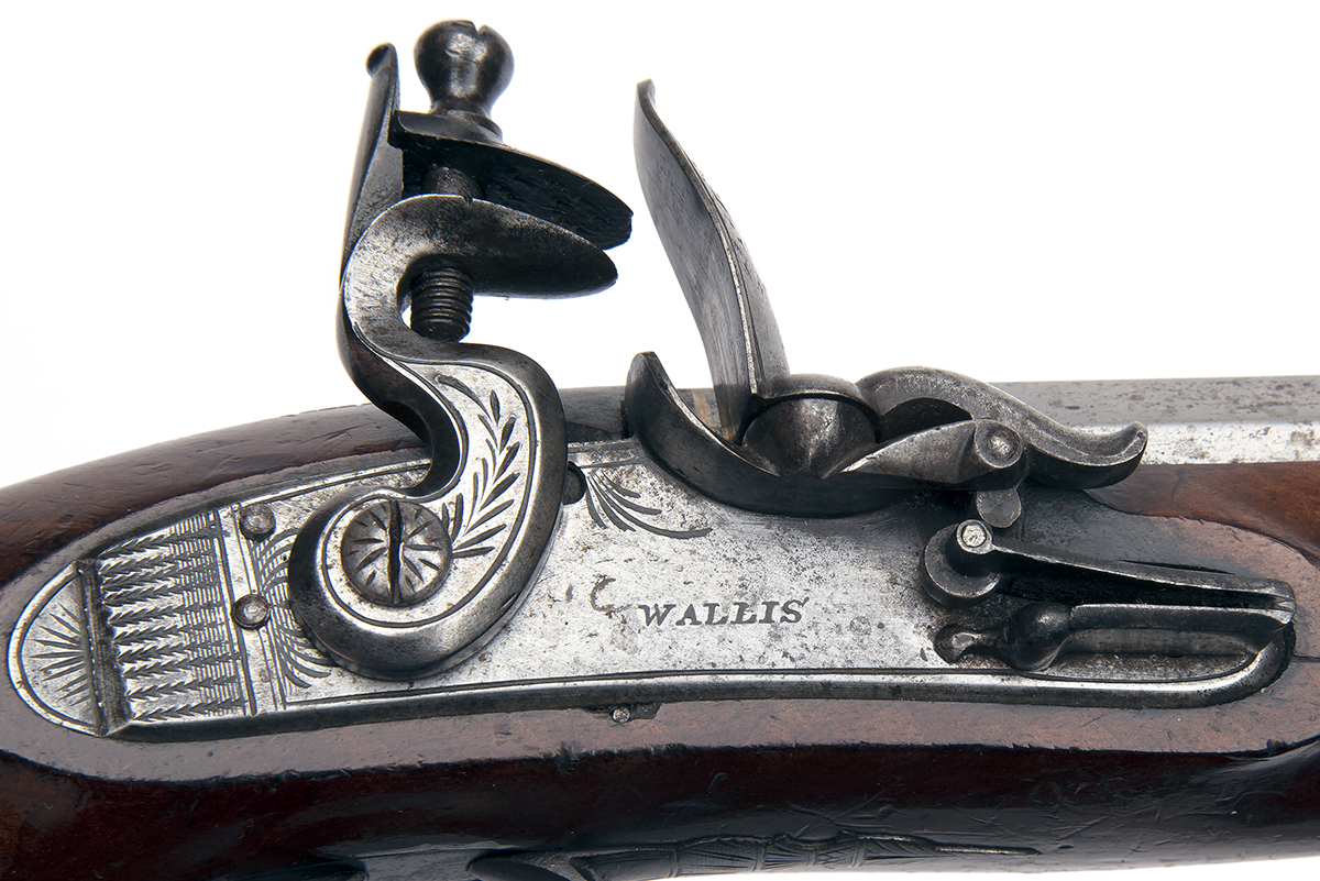 circa 1810, with brushed bright octagonal 5in. barrel, Birmingham proofs, yellow metal band at breech, acanthus leaf engraved top-tang, flat slightly curved lockplate with engraved stepped round tail, 'WALLIS' signature below the semi rainproof pan, roller frizzen spring, engraved swan-necked cock, walnut full-stock with 'Durs' style dot and checkerboard bag-shaped butt, guarded trigger with engraved bow and probable replacement iron ramrod, 10 1/2in. overall, weight approximately 1 1/8lbs.