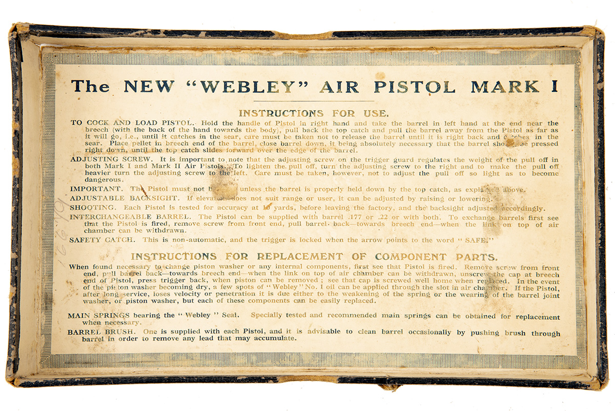 circa 1929, with 7 1/8in. rifled barrel, blued stepped air-chamber, the right hand side marked 'WEBLEY AIR PISTOL MKI', 'MADE IN ENGLAND' over 'A.F. STOEGER INC' together with 'NEW YORK', 'SOLE U.S. AGENTS' and 'USA PATD JULY 7 1925', the left side with 'BRITISH PATENT 219872' and 'WEBLEY & SCOTT LTD. BIRMINGHAM & LONDON', five pin trigger group including trigger weight adjuster, rotating safe and smooth straight walnut grips with the Webley 'winged bullet' trademark medallion inlet into the left hand example, the whole retaining much original finish, 9 1/4in. overall and complete with its maker's card carton (wear to edges) retaining loose instruction leaflets, a spare breech-washer in its paper envelope and a rectangular dark blue card box of sample pellets marked for 'THE NEW WEBLEY AIR PISTOL MKI' (stained, only partial contents), weight of pistol approx. 2lbs.