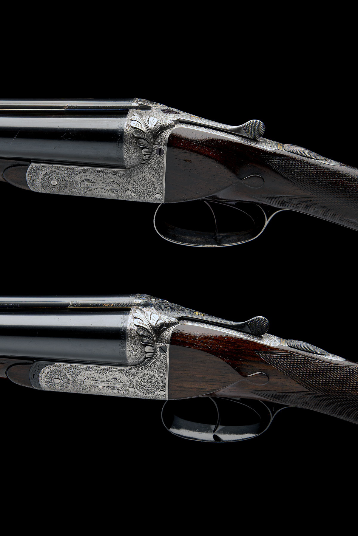 for 1901, 30in. Whitworth-steel nitro barrels (No.1 reproved in 2010), the ribs engraved 'WILLIAM EVANS FROM PURDEY'S. 63. PALL MALL. ST. JAMES'S. LONDON. SIR JOSEPH WHITWORTH'S FLUID PRESSED STEEL', and gold-inlaid '1' and '2' at the breech ends, 2 1/2in. chambers, bored approx. 1/2 and full choke (No.1), 1/4 and full choke (No.2), No.1 right wall thickness at 20- and with some external pits, No.2 bore dimensions marginal, treble-grip actions with removable striker discs, carved leaf fences, slender toplevers gold-inlaid '1' and '2', automatic safeties with gold-inlaid 'SAFE' details, intercepting sears, fully engraved with fine acanthus scrollwork with floral bouquets, brushed bright and reblued finish, 14 7/8in. well figured stocks (No.1 cracked at hand, No.2 a replacement) with engraved steel heel and toe plates, bolstered fore-end woods, weight 6lb. 7oz. (No.1) and 6lb. 5oz. (No.2)