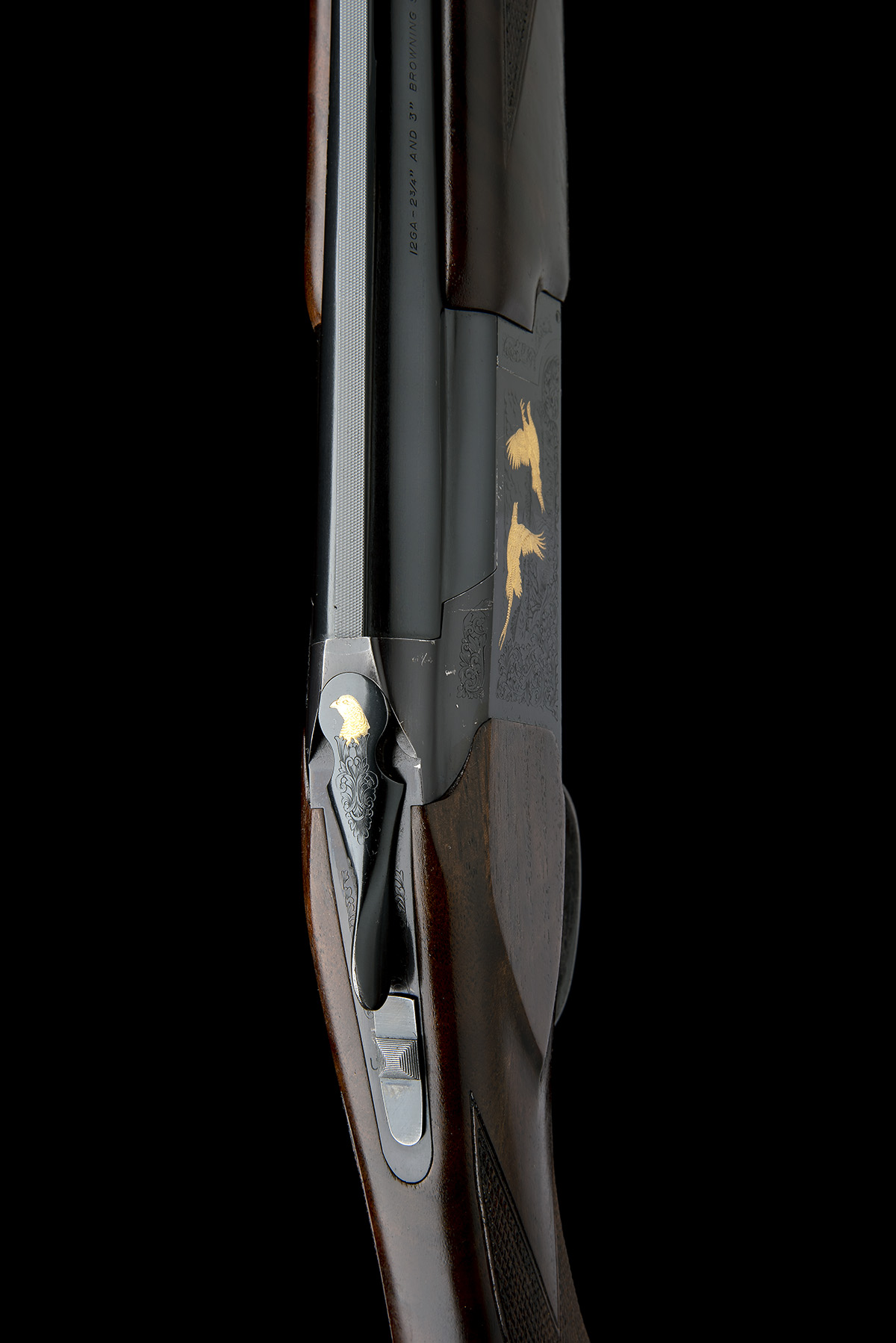dated 2017, 30in. nitro barrels with 6mm ventilated matt top-rib, 3in. chambers, multichokes (one spare), hold-open toplever, manual safety with integral barrel selector switch, gold-washed single trigger, acanthus scroll engraving surrounding gold-highlighted scenes of pheasant and partridge in flight, blacked finish, 14 3/4in. semi-pistolgrip stock including 7/8in. rubber recoil pad, weight 7lb. 11oz., in its makers universal case