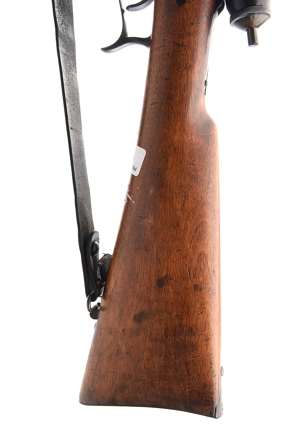 with 33in. barrel fitted with block and blade front-sight and quadrant rear-sight, two piece iron mounted full walnut stock the forend with square cut chequering and three barrel bands, complete with rod and an old leather sling. The barrel and action with some original finish in protected areas, balance to a grey / brown patina some light speckling.