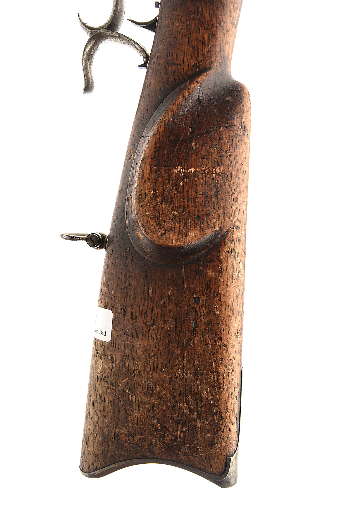 36 in. octagonal to round barrel with dovetailed block and blade front-sight, and quadrant rear-sight the action body signed on the lefts "J. J. SCHLAEPFER / GLARUS" the rifle is fitted with double set triggers and the action operating lever formed in a double scroll for grip when shooting, two piece walnut stock the forend secured to the barrel by flat keys or wedges, the butt with a cheek-rest and an iron butt-cap, rod missing.