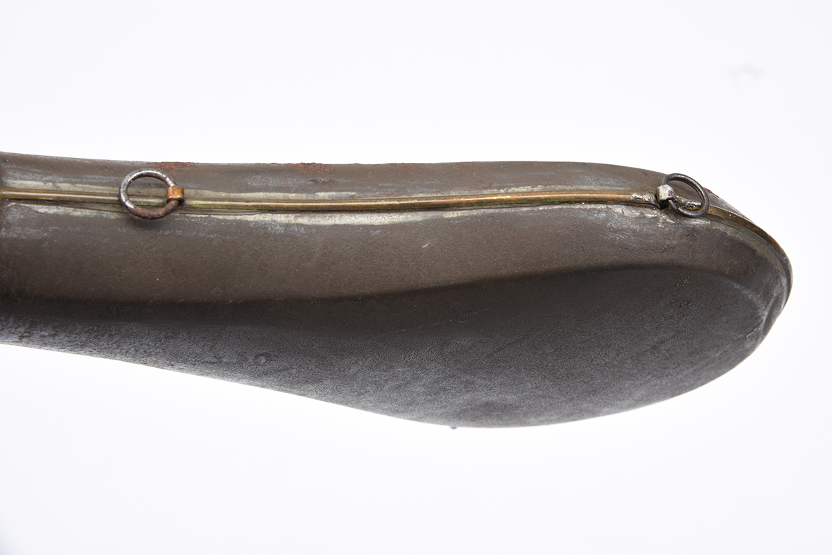 A MOST UNUSUAL TIN-BODIED TWIN-NOZZLE POWDER-FLASK TOGETHER WITH A DOUBLE LEATHER SHOT-BELT, the first of sporting gun size, with twin brass nozzles and double dispensing cap, the second of Irish form with automatic cut-offs