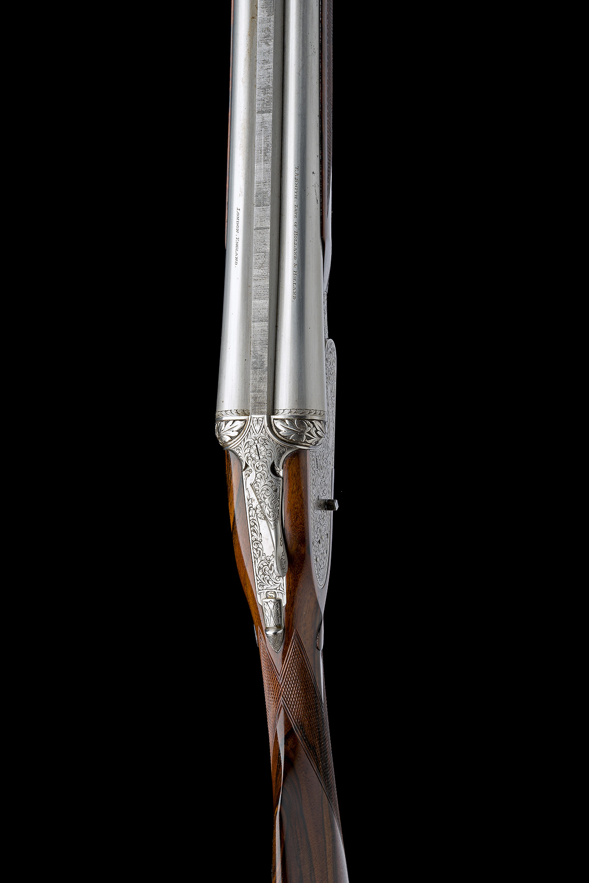 for 1996, both pairs of 30in. nitro chopperlump barrels in the white, lumps numbered '1' and '2', broad raised file cut ribs, the tubes engraved 'T.A. SMITH. LATE OF HOLLAND & HOLLAND. LONDON, ENGLAND.', the undersides with 'T.A. SMITH LONDON MADE IN ENGLAND', the short ribs with 'GRIFFIN & HOWE CO NY. NY.', 2 3/4in. chambers, retaining full choke in all, internally retaining some internal machine marking towards muzzle ends, self-opening action with raised central section of standing breech to meet raised ribs, toplever not returning to centre on closing (moreso No.1 barrels), removable striker discs, manual safety, protruding tumblers in square section, rolled-edge triggerguard, the fences carved in high relief with climbing leaves on a matted background, the action and furniture with bold scrolling acanthus and ornate bordering, the underside with a vignette of a lone vixen in a woodland setting, 14 3/4in. figured stock with diamond grip, beavertail fore-end (missing Anson rod grub screw), weight 7lb. 12oz.