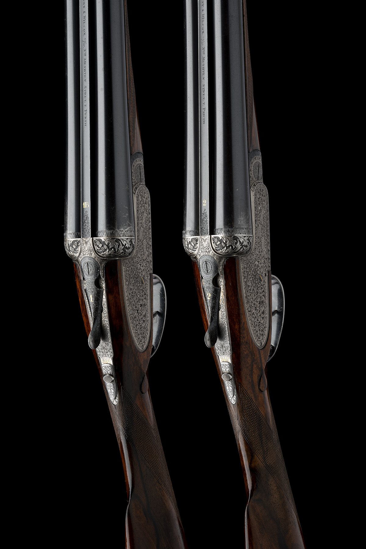 for 1995, 29in. nitro chopperlump barrels, the ribs engraved 'HENDRY RAMSAY & WILCOX 55/57 NTH. METHVEN STREET. PERTH.', and gold-inlaid '1B' and '2' at the breech ends, 2 3/4in. chambers, bored approx. imp. cyl. both (No.1) and imp. cyl. and 1/4 choke (No.2), toplevers gold-inlaid '1' and '2', automatic safeties with gold-inlaid 'SAFE' details, removable striker discs, gold-inlaid cocking-indicators, articulated front triggers, rolled-edge triggerguards, the actions, furniture and lockplates profusely engraved with bold acanthus scrollwork with beaded bordering and interspersed with carved thistle designs, the fences carved in high relief with further thistles on a dark stippled background, the undersides with depictions of the MacNab quarry and the makers name in scrolling banners, bright finish, 15 1/4in. boldly-figured stocks (minor setting cracks to rear of top tangs), fore-ends missing finials, weight 6lb. 15oz.
