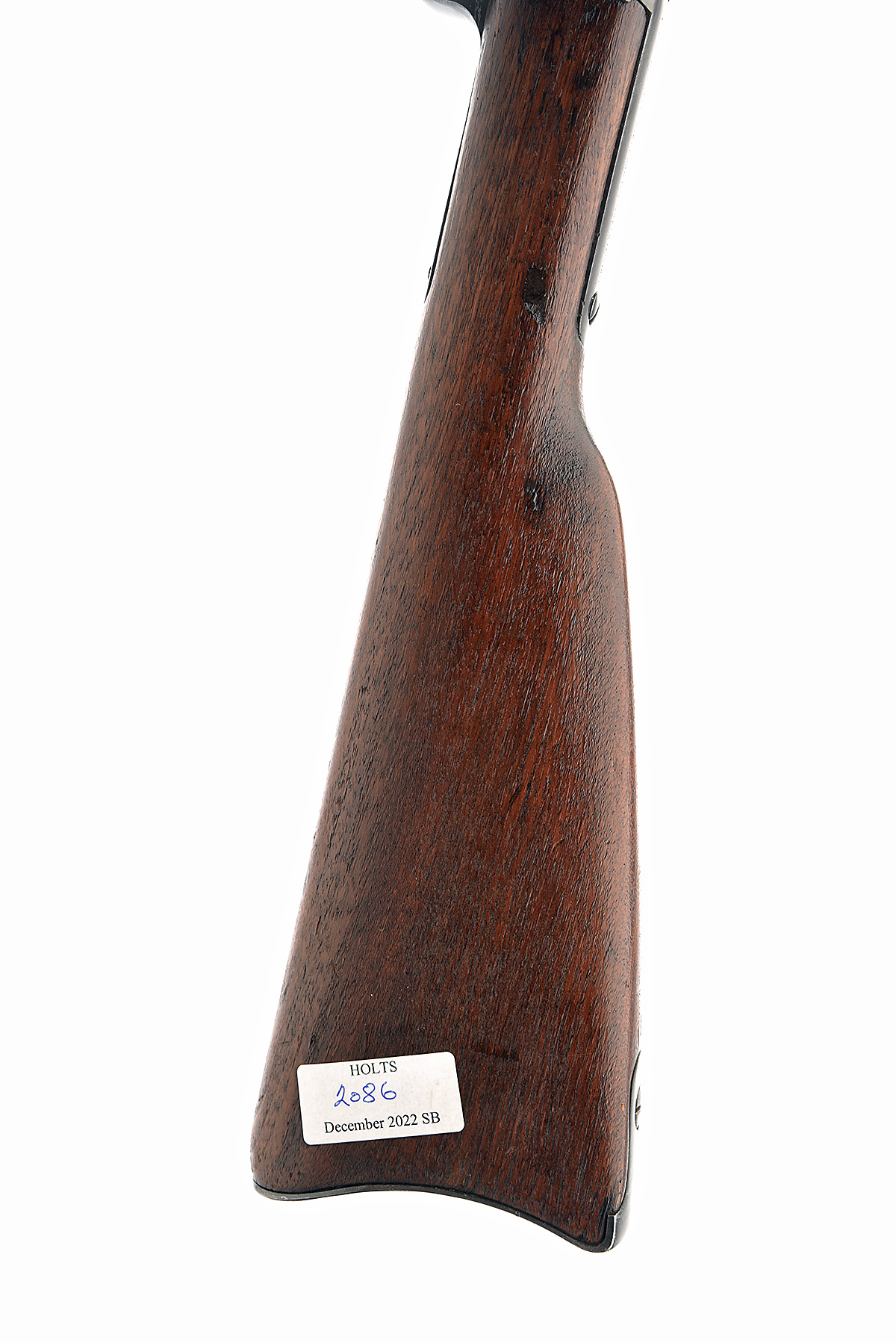with 20 1/2 in barrel fitted with leaf battle-sights, the breech stamped 'MODEL ARGENTINO 1879 E.N.' the action tang stamped with the usual Remington address and patent legend, iron mounted two piece walnut stock, good stock, barrel and action reblued