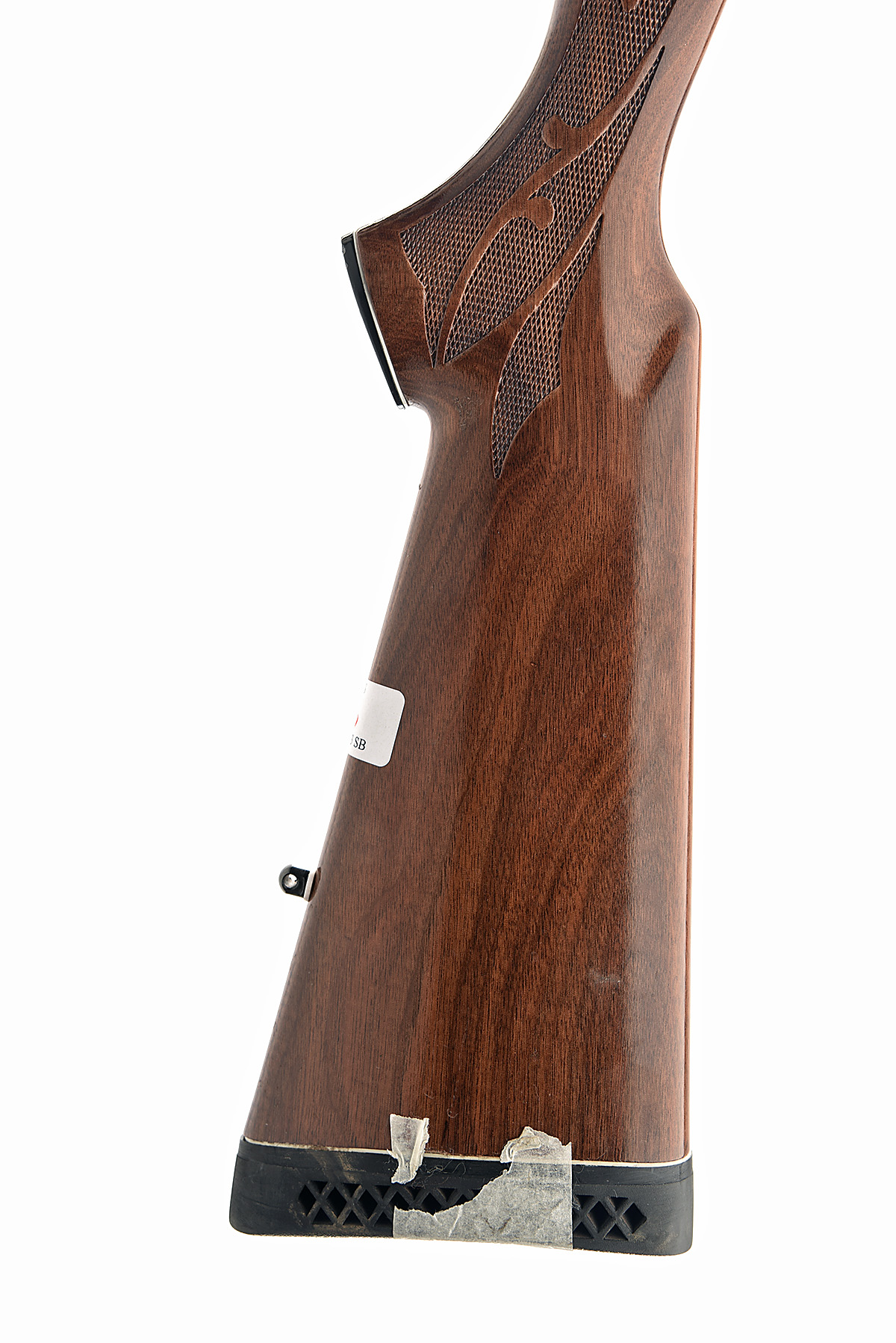 A LEFT-HANDED REMINGTON 12-BORE 'MODEL 1100' SEMI-AUTO SHOTGUN, serial no. M952007V, circa 1979, restricted magazine, 25 3/4in. nitro reproved (in 2023) barrel with 8mm ventilated matt rib, 2 3/4in. chamber, bored approx. true cyl., manual push-button safety, partial acanthus scroll engraving, blacked finish, 14 3/4in. ornately chequered pistolgrip stock including ventilated rubber recoil pad