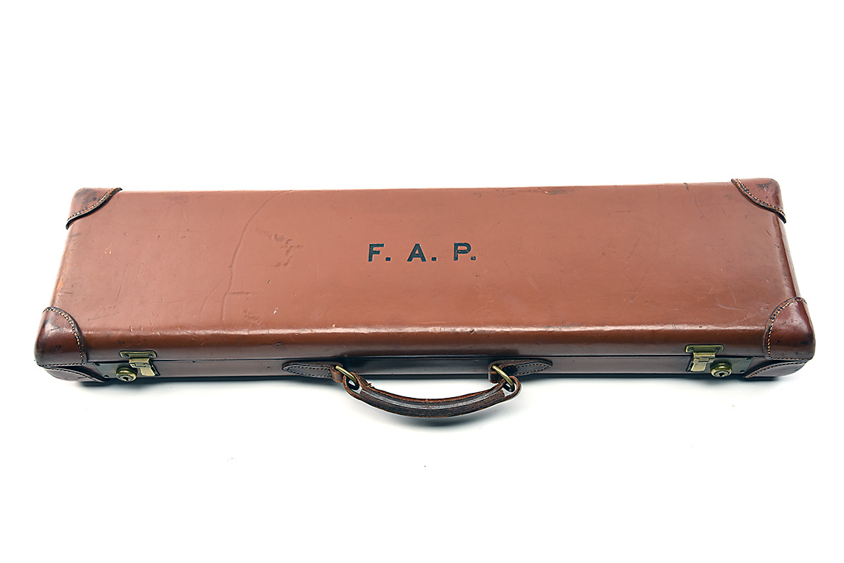 fitted for 26in. barrels, the interior lined with maroon baize, a pair of 12-bore snap-caps, oil bottle, two brass locks (keys missing), the lid exterior with the initials 'F.A.P.'