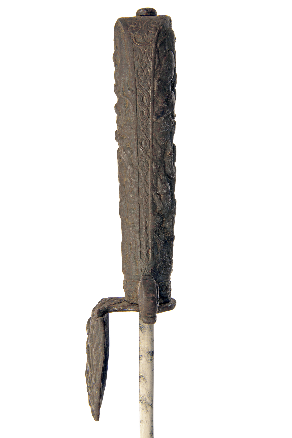 circa 1900, with 17in. single-edged steel blade fullered on each side, ricasso marked 'ALEX COPPEL / SOLINGEN' with scales trade-mark, cast spelter hilt and crossguard depicting scenes of hunters, bears and dogs, black leather scabbard with nickel steel fittings, a few stains to the blade, light surface rust to the scabbard fittings, stitching solid, a good example, 23 3/4 in. overall