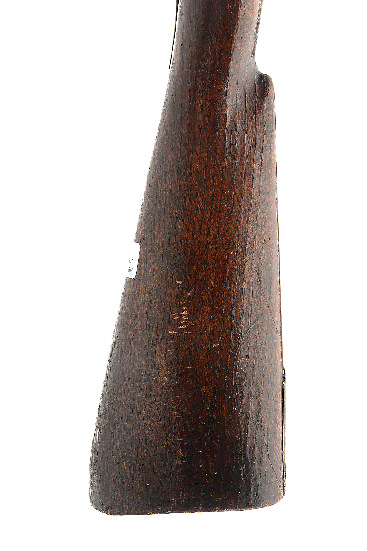 A 10-BORE FLINTLOCK FOWLING-PIECE TOGETHER WITH A VICTORIAN LEATHER SHOT FLASK & A 12-BORE ROLL TURNOVER TOOL the first circa 1740, with 48in. iron barrel, plain unbridled lock and restocked in antiquity with a teak half-stock (iron surfaces corroded, the two accessories circa 1880, the first with brass spout, the second with traces of green paint to the body