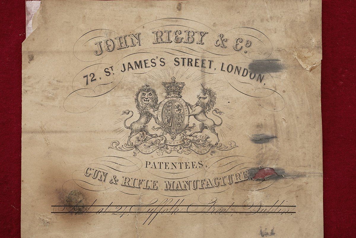 A MAHOGANY PISTOL CASE PROBABLY FOR A HOWDAH-PISTOL, WITH JOHN RIGBY LABEL,