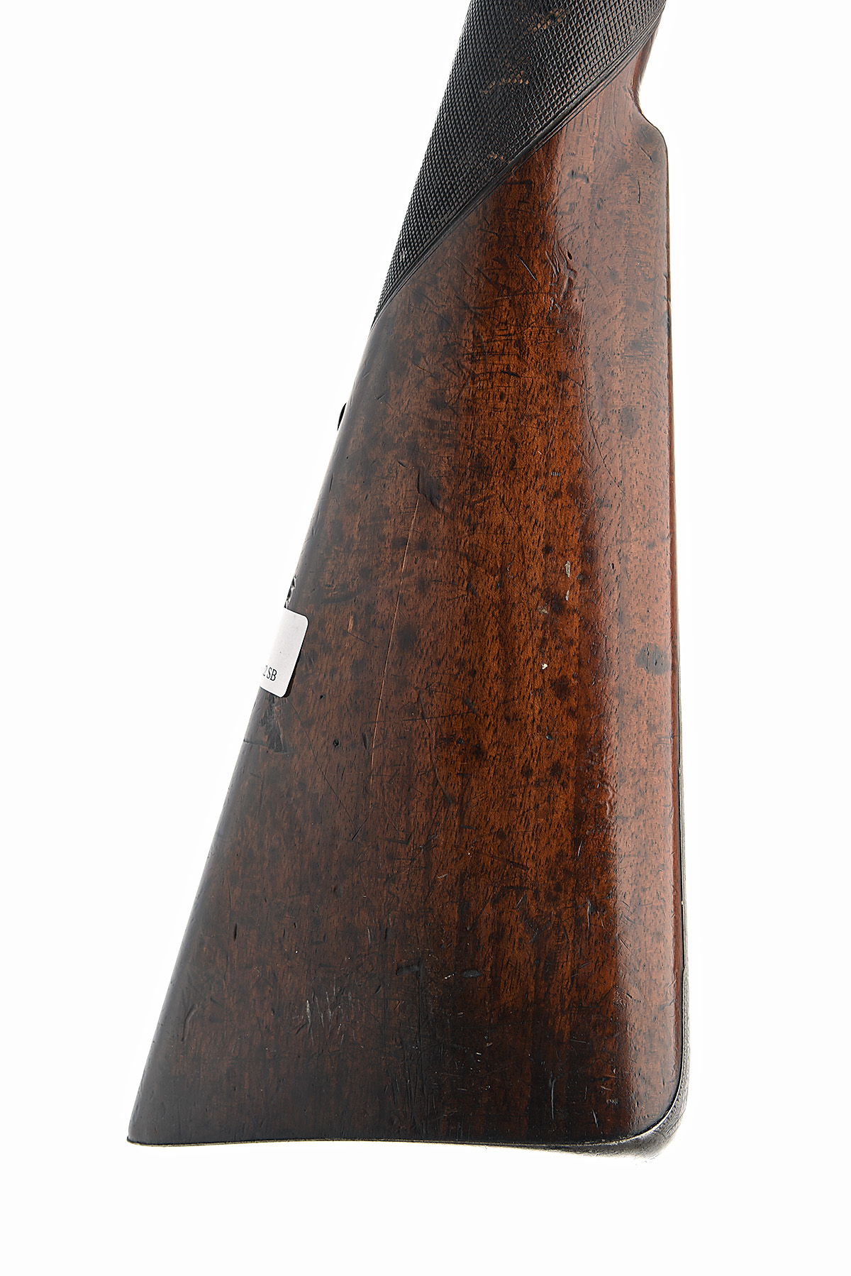 AN 8-BORE PERCUSSION TUBE-LOCK FOWLING-PIECE SIGNED GULLEY, LONDON, no visible serial number, with octagonal to sixteen-sided to round 36in. barrel, engraved breech-block and top-tang, plain flat lock, walnut half-stock chequered at the wrist (large inlet repair forwards of lock) and iron furniture