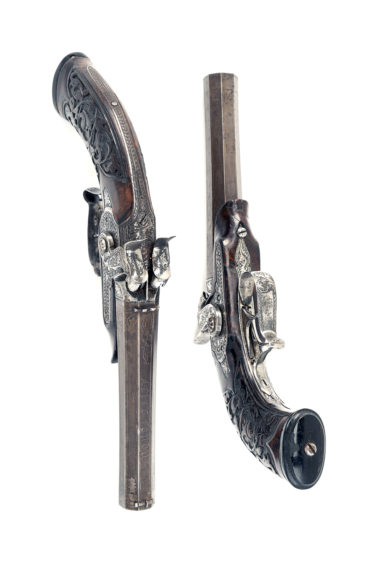 probably Belgian circa 1840, with octagonal slightly swamped 5in. barrels respectively numbered at the breech for the pair, the flats etched with panels ending in foliate terminals, the top-flat also etched 'ACIER FONDU', dove-tailed fore-sight, standing notch rear-sight, carved and engraved breech with twin nipples, fully border and scroll engraved locks with shaped and moulded hammers, en-suite top-strap with integral near full length back-strap, walnut grips carved with running vines and flared ebony caps (both fore-end tips with repairs), twin triggers and semi-spurred trigger-guards, in a continental style fitted case with a number of assembled accessories