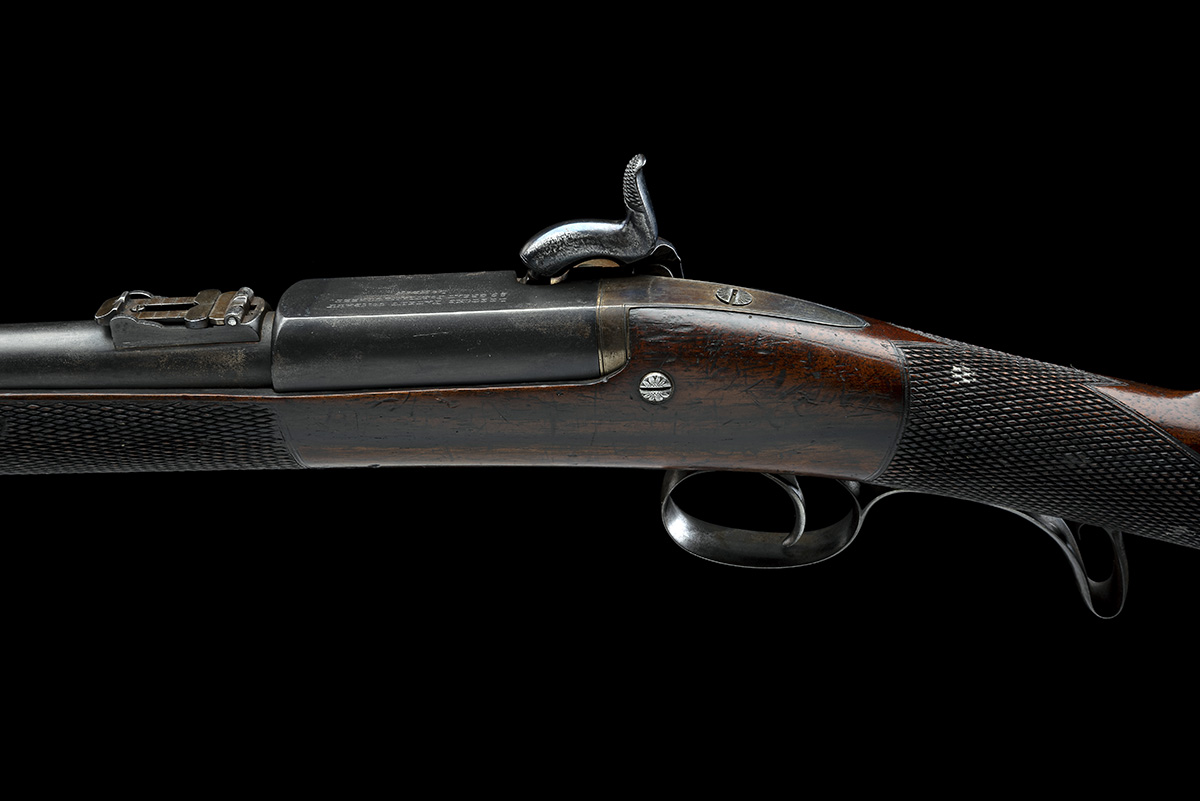 with 15in. London proofed barrel rifled with three grooves, block front-sight with dovetailed blade, small carbine pattern 1860 style ladder rearsight, the action top signed 'LEETCH 'S PATENT COMPANY / 29 GREAT PORTLAND STREET / LONDON', back-action lock engraved 'LEETCH'S PATENT / COMPANY', iron mounted full walnut stock with scroll trigger-guard, chequered wrist and fore-end, the barrel secured by just one band. A rare collector's gun.