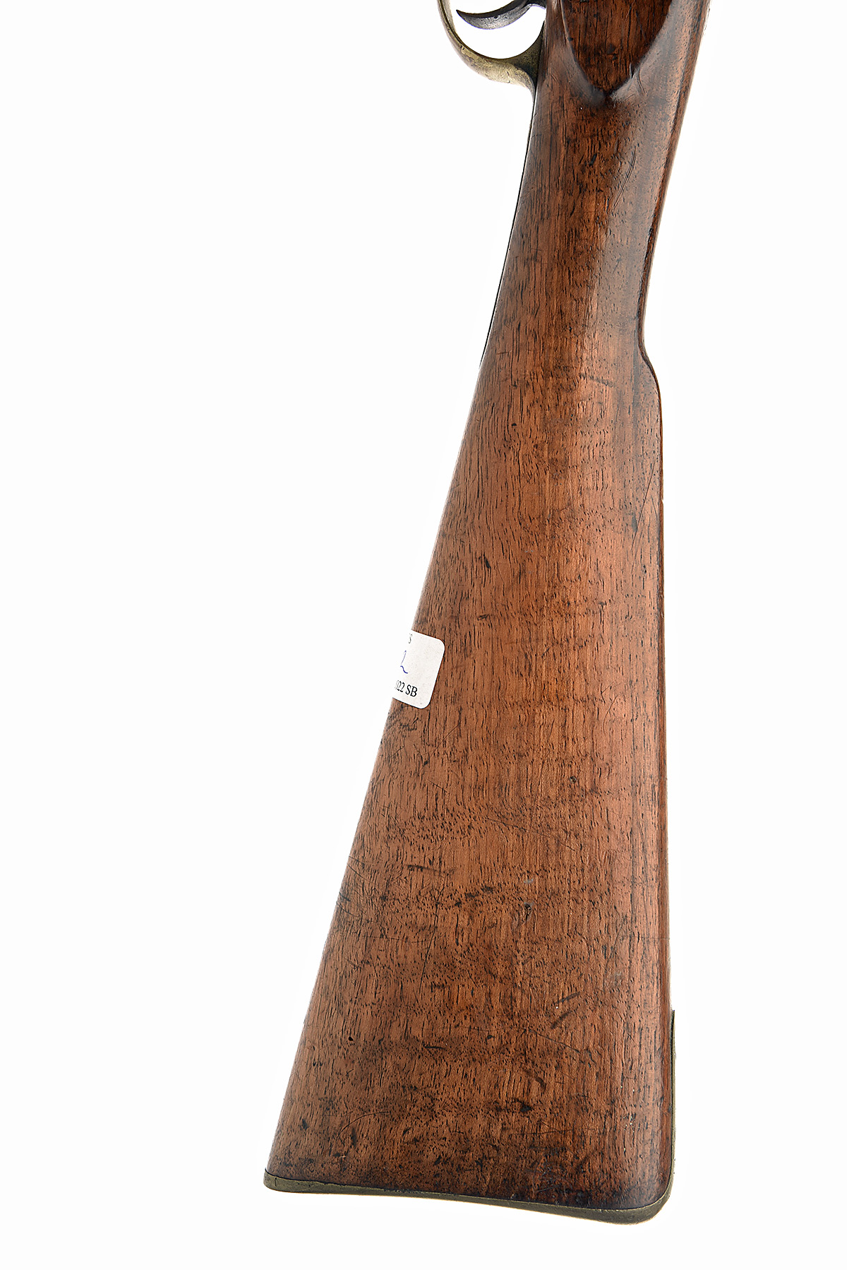 A .577 PATTERN 1853 ENFIELD THIRD MODEL THREE BAND PERCUSSION RIFLE TO THE MIDDLESEX VOLUNTEERS, CIRCA 1858 issue no 372, with 37 1/2 in barrel the breech profusely Ordnance marked, fitted with military pattern sights, the borderline engraved lock with the Crown V.R. cypher on the tail and '1858 TOWER' to the centre, regulation brass mounted full walnut stock, the butt stamped with the W.D. Pimlico roundel dated 1862 together with a 2nd class stamp, indicating the rifle was refurbished at the Governments Pimlico Depot in 1862 and downgraded to 2nd class before issue to the volunteers, the butt-cap tang engraved 'V / Mx 26 / 372' showing the gun was issued th the 26th company Middlesex Rifle Volunteers gun no. 372, the 26th were the Customs House Company, barrel slightly shortened, breech plug not correctly fitted, and hammer screw and rammer missing, good stock