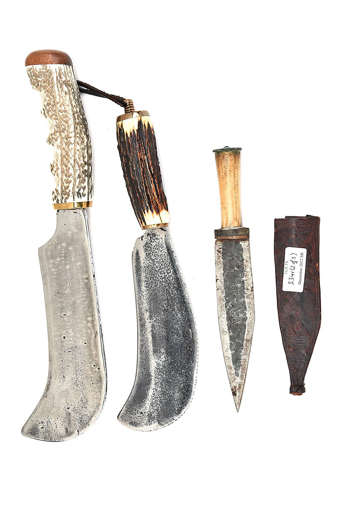 AN ASSORTED LOT COMPRISING TWO BILL HOOKS, ONE MACHETE, ONE AFRICAN DAGGER AND ONE GURKHA KUKRI, one bill hook with staghorn grips, the other with faux staghorn grips, blades polished bright, the machete dated 1843 and with replacement wooden grips, in replacement leather scabbard, the african dagger with bone grip, and embossed leather scabbard, kukri of tourist type with scabbard and one side knife