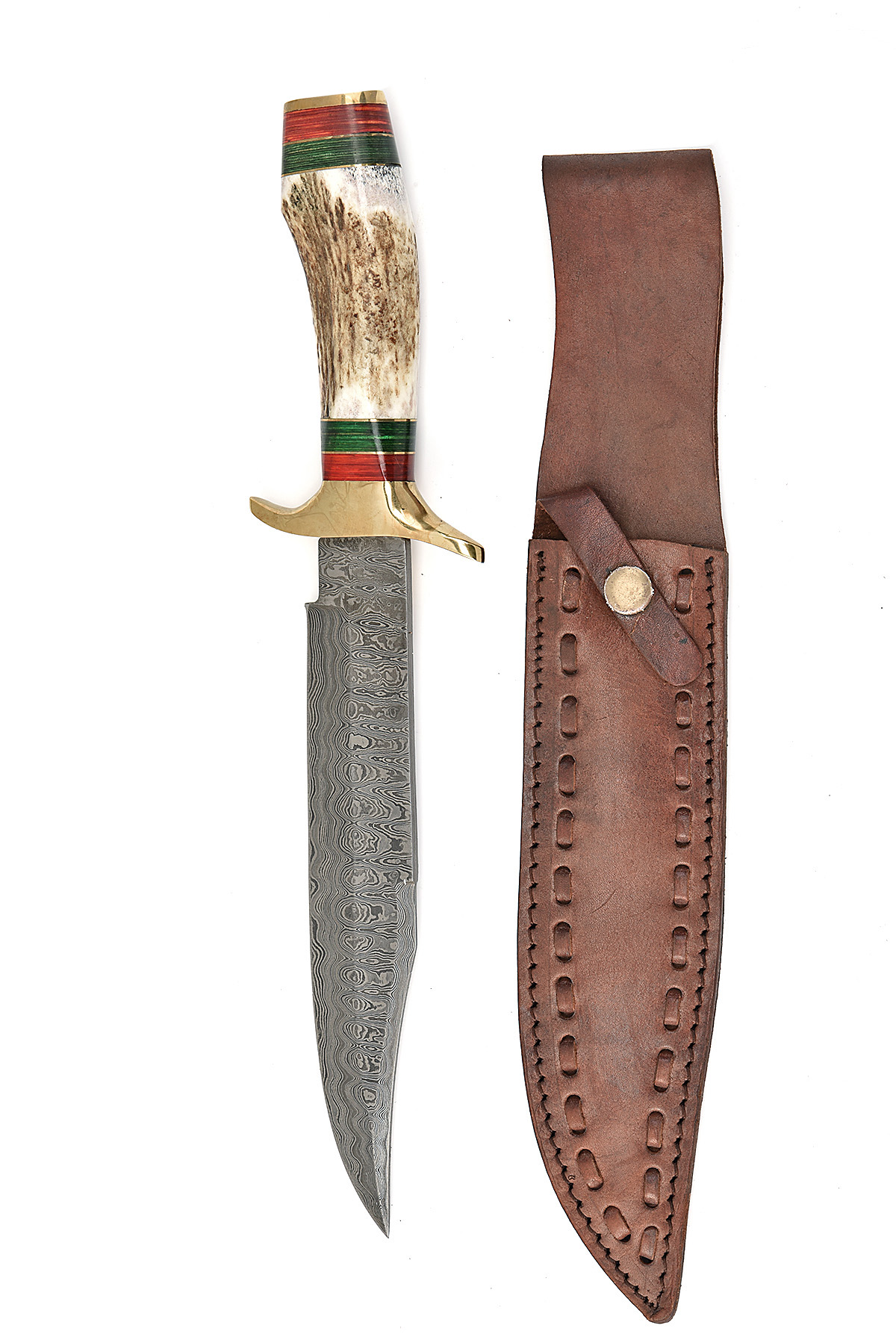 TWO BOXED AS NEW DAMASCUS BLADED BOWIE KNIVES both with 9 in. Damascus blades brass hilts and staghorn grips, and brown leather sheaths, contained in their original white cardboard boxes marked 'DAMASCUS BLADE KNIFE', as new and unused.