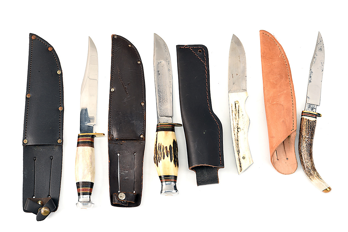 EIGHT ASSORTED SHEATH KNIVES VARIOUS TYPES AND STYLES two with 6 in. blades, one with 5 1/2 in. blade, two with 5 in blades and three with 3 1/2 in. blades, various hilt and grip styles and materials, all with leather sheaths,