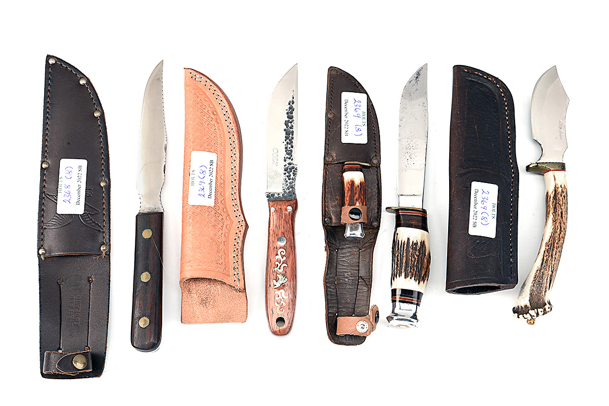 A COLLECTION OF EIGHT ASSORTED SHEATH KNIVES, of assorted sizes, styles and forms, blade lengths from 3in. to 5in. one by Colt, in assorted conditions some new and some used all with sheaths