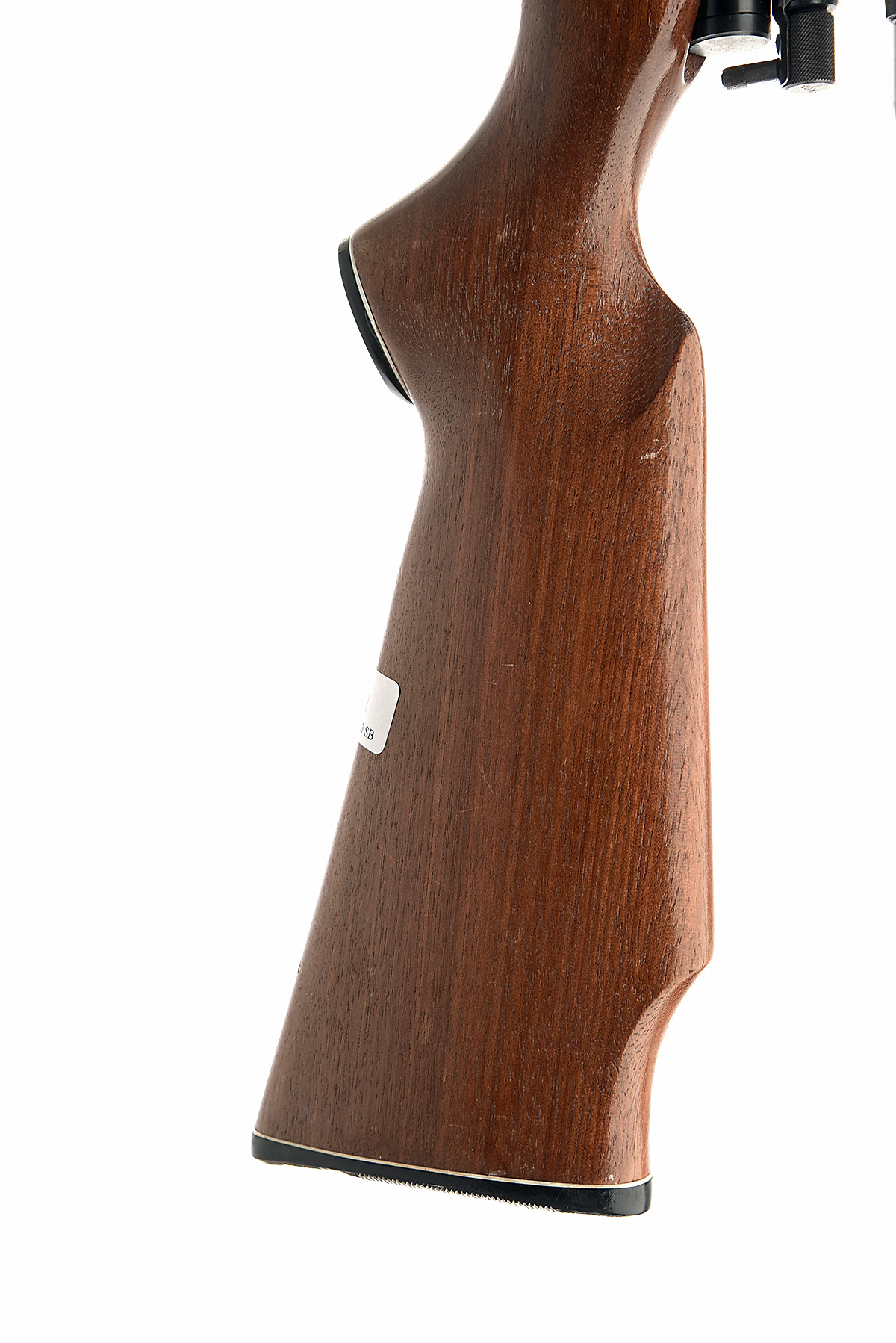 A SCARCE .22 MULTI-PUMP AIR-RIFLE, SIGNED SHARP, 'MODEL ACE', serial no. A567685, 27in. unsighted barrel including sound moderator, receiver fitted with a Bisley telescopic sight, blued finish, dark hardwood pistolgrip stock, 14in. pull