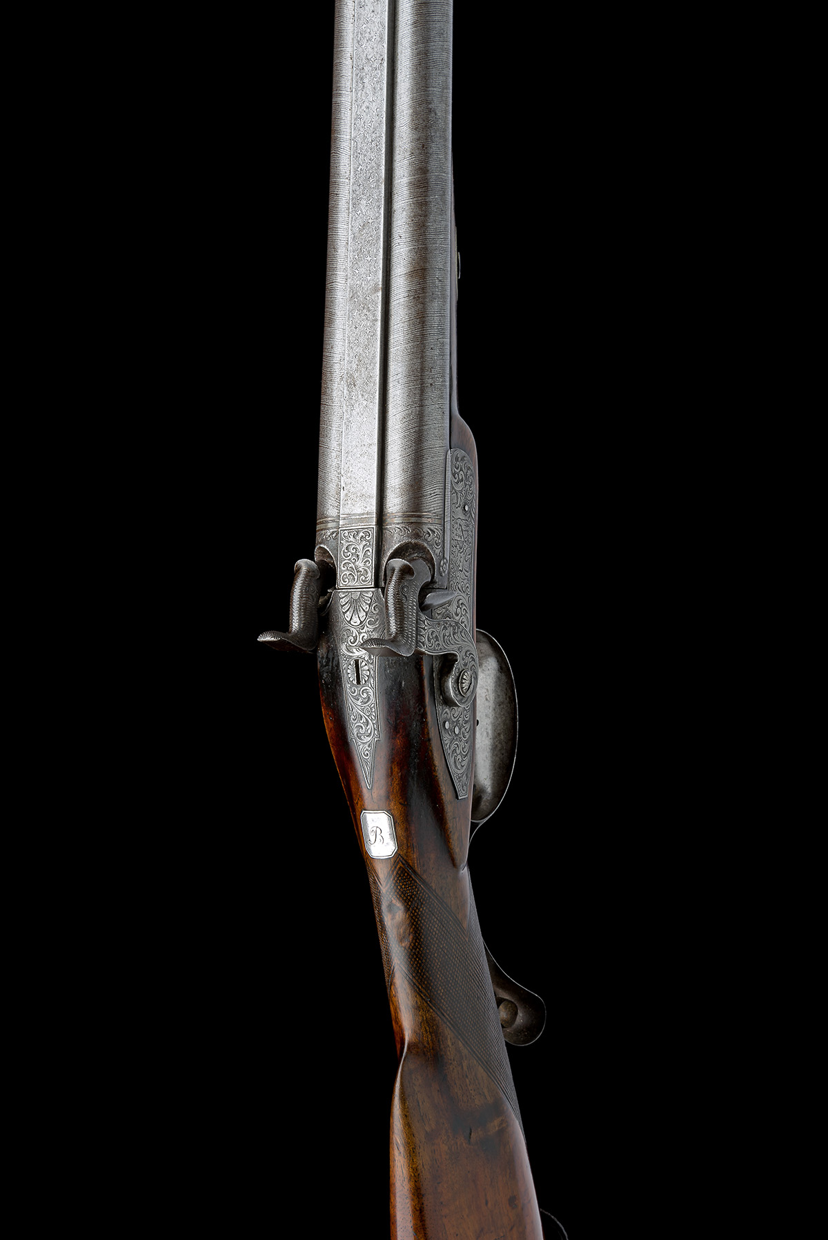 A 14-BORE PERCUSSION DOUBLE-BARRELLED SPORTING GUN SIGNED DELCOMYN, COPENHAGEN, no visible serial number,
