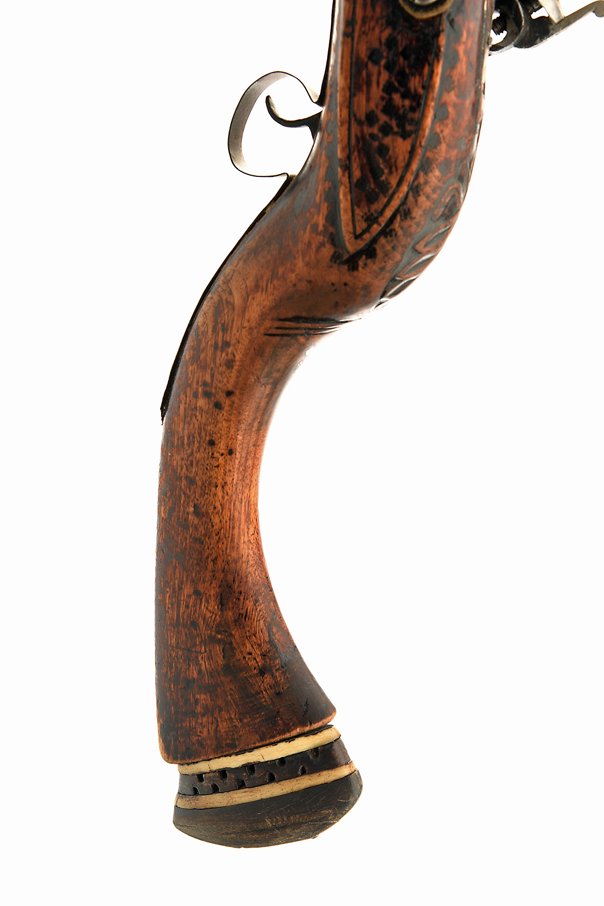 * AN INDO-PERSIAN 20-BORE FLINTLOCK CAMEL-GUN WITH EAST INDIA COMPANY LOCK SIGNED MEMORY, no visible serial number, circa 1820, with 45 1/2in. barrel swelling at the muzzle, re-purposed lock from a Brown Bess musket with East India Company heart trade-mark at tail, dated 1779 and signed 'MEMORY' (lock loose), hardwood full-stock with exaggerated curved butt, horn and bone heel-pad and mixed metal furniture, fitted with a period leather sling