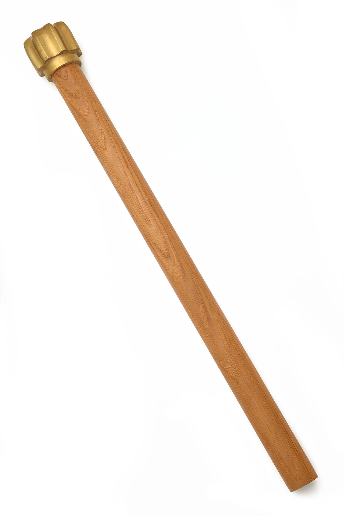 A GROUP OF TWO LARGE KNIVES PLUS A REPRODUCTION TRENCH MACE AND A SPEARHEAD, late 20th Century, the knives probably from Pakistan, with 12 in. single-edged damascus blades with a single narrow fuller each side towards the edge, damascus hilt with wooden handle, one with a black leather scabbard, plus a brass-headed trench mace 20 in. overall and a 14 in. steel and brass spearhead