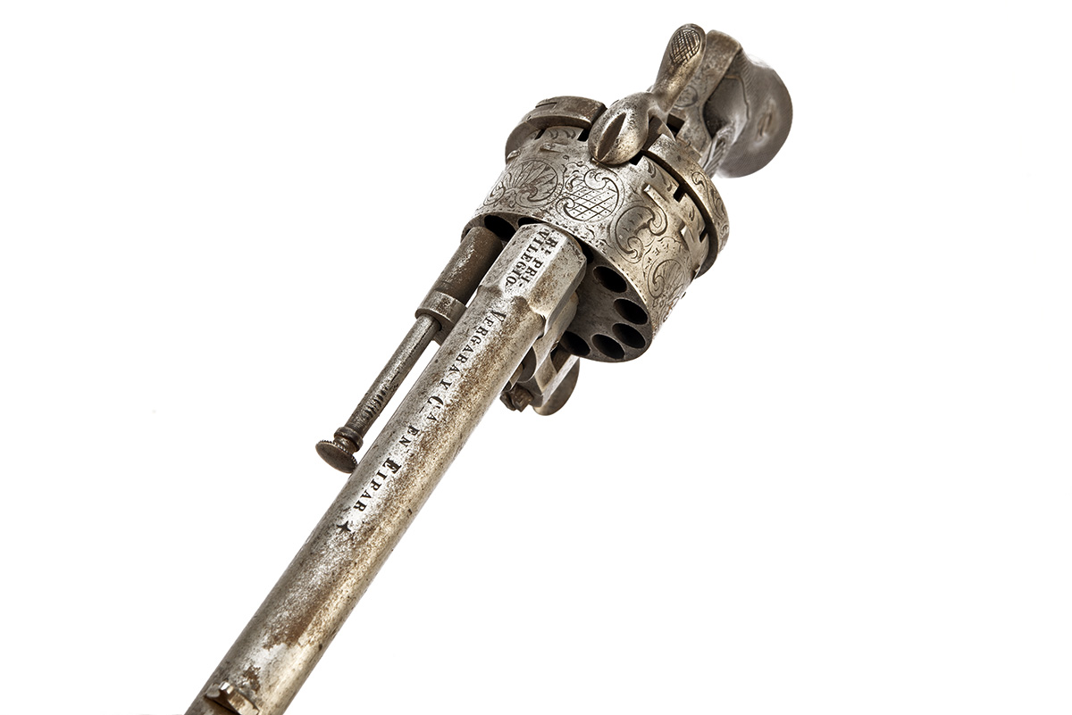 AN UNUSUAL SPANISH 7mm DOUBLE-ACTION 12-SHOT PINFIRE REVOLVER, SIGNED 'REAL PRIBILEGIO', no visible serial number, circa 1860, with 4 3/4 in. round to octagonal sighted barrel signed 'Rl. PRIBILEGIO – VERGARA Y CA – EIBAR', engraved cylinder and frame, stepped handle with chequered wooden grips, lanyard ring, hinged trigger, side-mounted ejector rod, hinged loading gate, worn and stained, engraving rubbed, overall length 9 1/2 in.