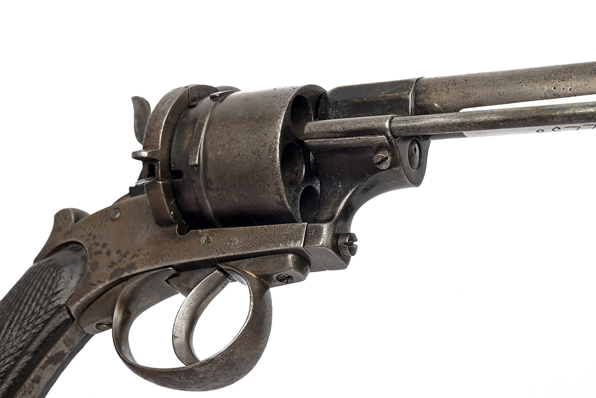 A 12mm PINFIRE BELGIAN REVOLVER, no visible serial number, of Lefaucheux style, with octagonal to round 4 3/4in. barrel, plain open iron frame, plain six-shot cylinder, guarded trigger and chequered bag-shaped walnut grips