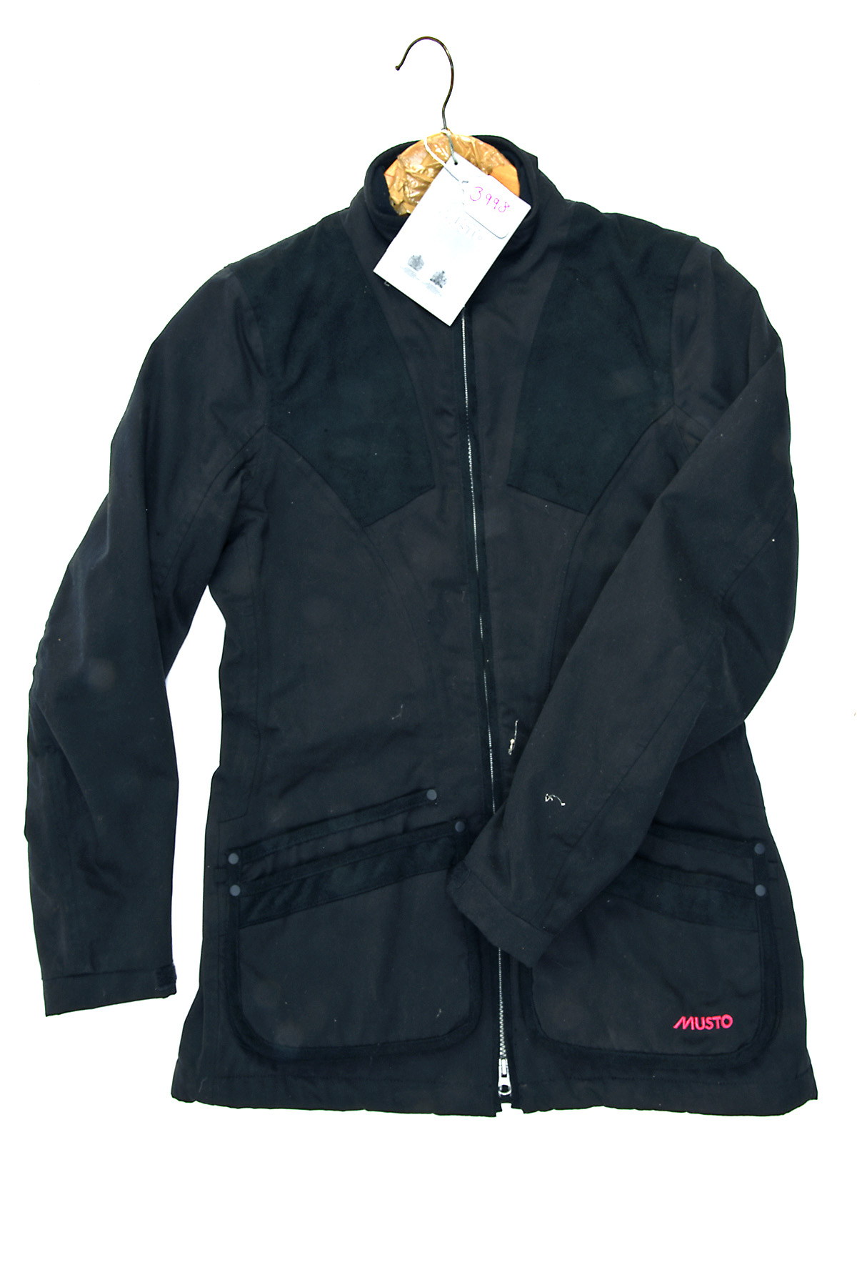 A UNUSED 'MUSTO' LADIES CLAY SHOOTING JACKET, D30 recoil pad facility, large cartridge pockets, waterproof in size 8