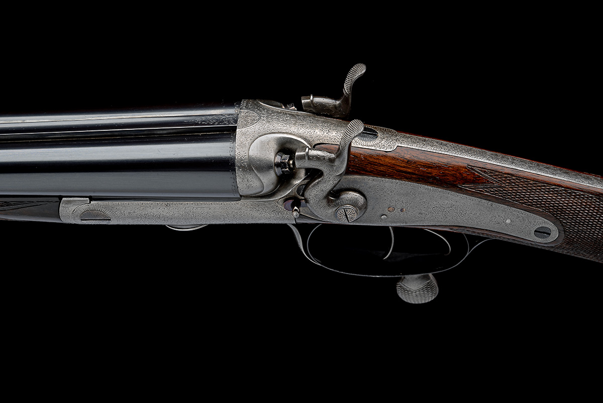 circa 1885 and smoothbored from a double hammer rifle, 28 1/8in. nitro reproved barrels, rib inscription rubbed, 2 1/2in. chambers, bored approx. true cyl. and 1/4 choke, minor denting, one large pit, Jones patent rotary underlever, carved percussion fences, elongated top-strap, bolted rebounding back-action locks with dolphin hammers, fine acanthus scroll engraving with floral bouquets, the left side of the bar with 'CHARGE 4 DRAMS CASE 3 1/4 INCHES', brushed bright and reblued finish overall, 14 5/8in. replacement stock including buttplate, weight 5lb. 15oz.