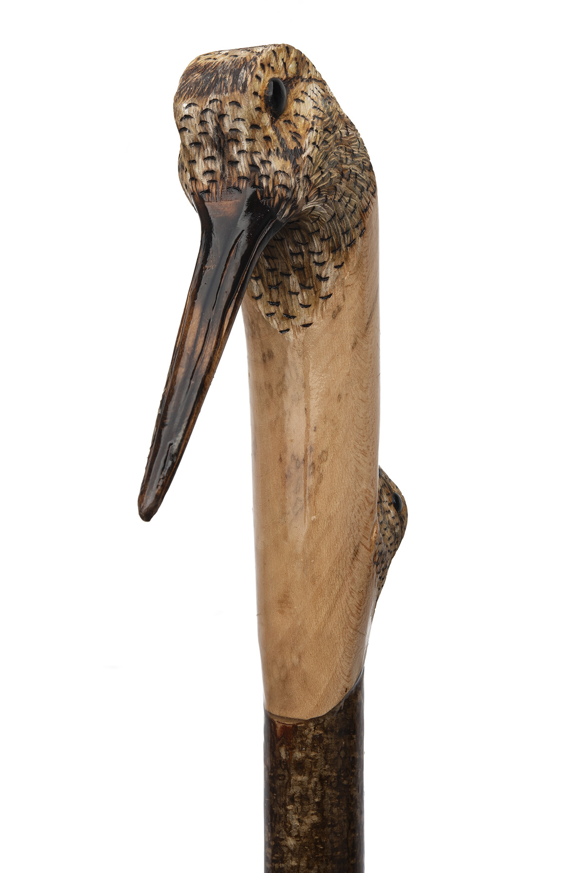 A FINE HAND-CARVED DOUBLE WOODCOCK WALKING STAFF,