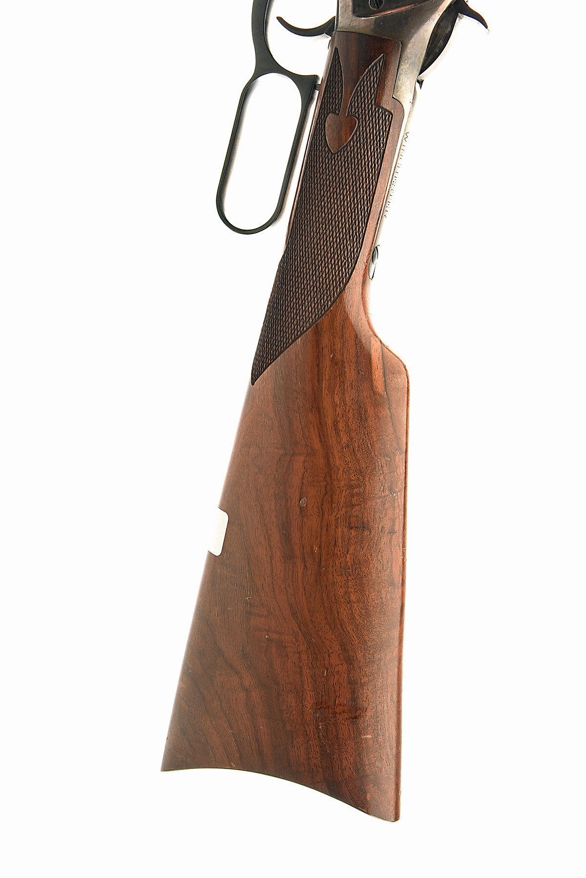 WINCHESTER .38-55 WIN. 'MODEL 94 - LEGENDARY FRONTIERSMAN' LEVER-ACTION REPEATING RIFLE, serial no. LF06911, for 1980,nitro reproved (in 2023) barrel, block-mounted bead fore-sight, adjustable open rear sights, the right hand side marked 'LEGENDARY FRONTIERSMAN', full-length tubular magazine, half-cock hammer safety, the receiver with border and acanthus scroll engraving surrounding scenes of a frontiersman guiding horses on horseback and a swooping eagle on the left and a frontiersman greeting Indians, and a bear, beaver and snake on the right, 13 1/4in. ornately chequered stock (some laquer peel), the right side with medallion depicting a frontiersman and Indian in battle, steel buttplate, weight 6lb. 11oz.