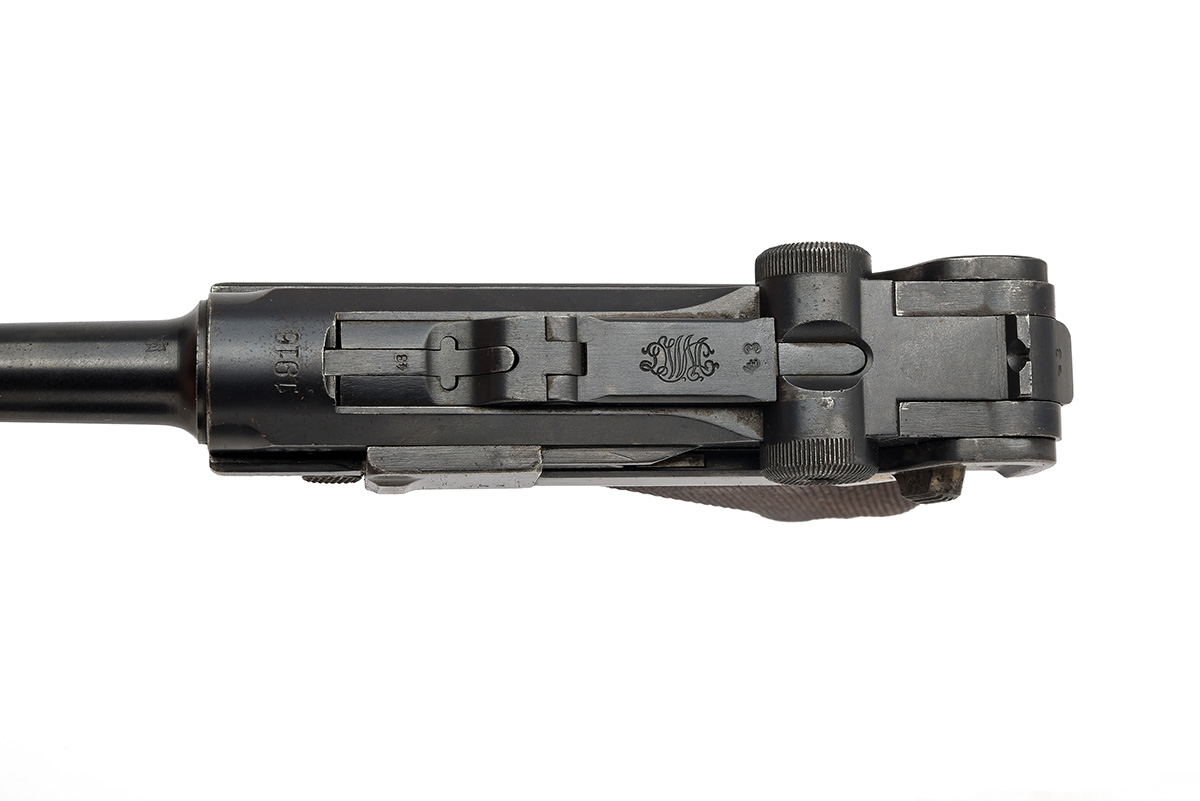 dated for 1916, with blued 4in. barrel, the nocksform with date, the toggle marked 'DWM', blued receiver and frame, much straw finish remaining to ancillaries, chequered walnut grips, retaining virtually all its original finish and complete with a wood-based magazine numbered '9140', together with a World War One brown leather holster for same marked internally 'CARL TRENNER BERLIN' and dated '1915', also inked with previous owners name overwritten 'BASKCOMB(E)?' and together with a further similar magazine numbered '5798', complete with a proof certificate