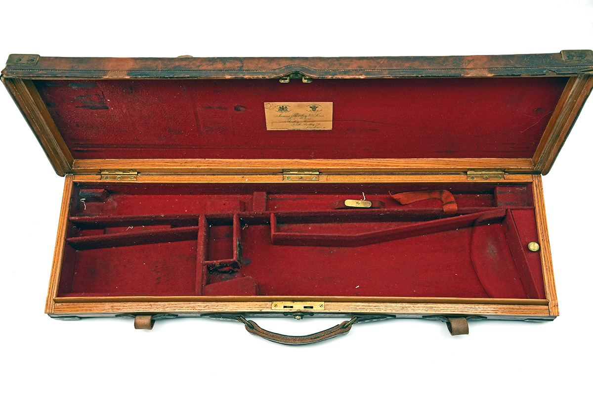 fitted for 30in. barrels, the interior lined with maroon baize, the lid interior with a James Purdey and Sons trade label, leather fixing straps, the lid exterior embossed 'R.T.', brass lock (key missing)