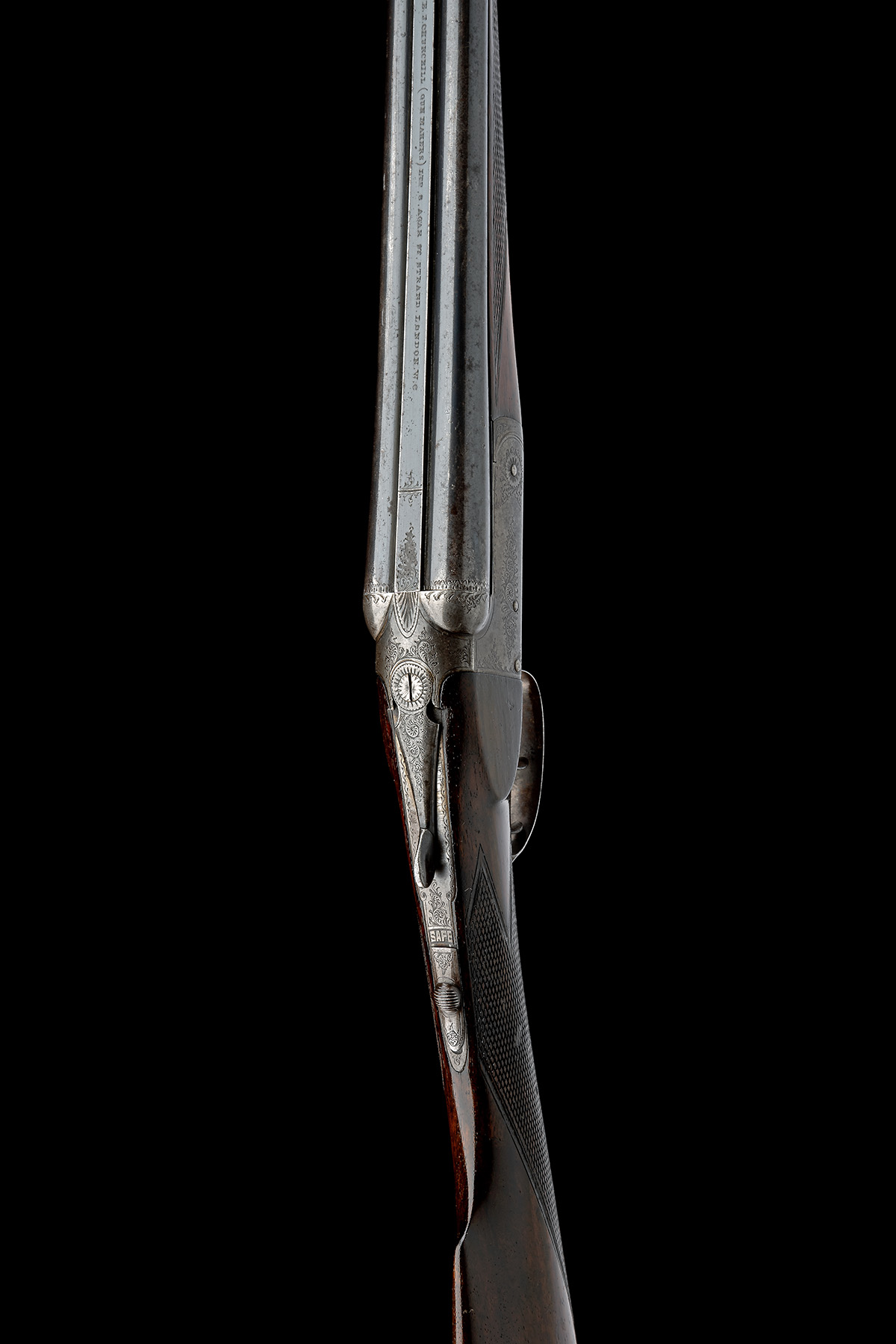 circa 1923, 27in. nitro reproved barrels (in 2024), the rib engraved 'E. J. CHURCHILL (GUNMAKERS) LTD. 8. AGAR ST. STRAND. LONDON. W.C.', 2 3/4in. chambers, bored approx. true cyl. and 1/4 choke, automatic safety, with engraved 'SAFE' detail, border and scroll engraving, very slight traces of original colour-hardening, 14 1/4in. stock including chequered buttplate, fore-end with Deeley & Edge release catch and horn finial, weight 4lb. 6oz.