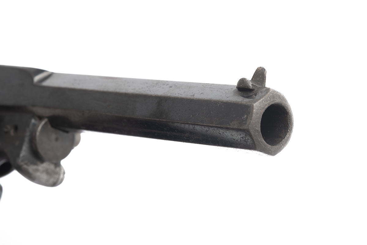 circa 1858, with blued octagonal 5 5/8in. barrel, dove-tailed fore-sight, shallow notch rear-sight to rear of the solid top-strap, borderline engraved solid frame with matching number five-shot plain cylinder, double action mechanism with spurred hammer, chequered walnut semi saw-handled grip and guarded trigger, the rammer an amateur replacement and cylinder arbor-pin retaining screw absent otherwise a strong amount of original blued finish