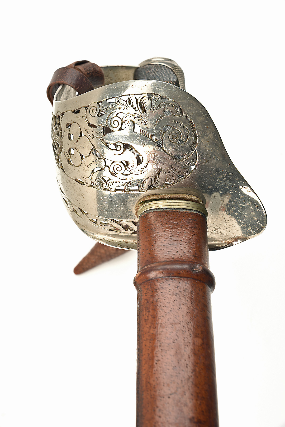 A PATTERN 1897 EDWARD VII INFANTRY OFFICER'S SWORD FOR THE HAMPSHIRE REGIMENT, early 20th Century, with 32 1/2 in. fullered and etched with scroll-work on each side, with king's crown and royal standard with Hampshire regiment coat-of-arms and '2nd Bn THE HAMPSHIRE REGt.' banner below, and royal cypher and 'E. A. C. 'over, ricasso with 'ROBt. MOLE & SONS / MAKERS / BIRMINGHAM' and proof plug over, hilt with nickelled guard with royal cypher, wire-bound fish-skin grip and leather sword knot, together with its brown leather field scabbard, scabbard with grazing and folded above the drag, vendor advises that this is a family piece and named to Lt E. A. Carver